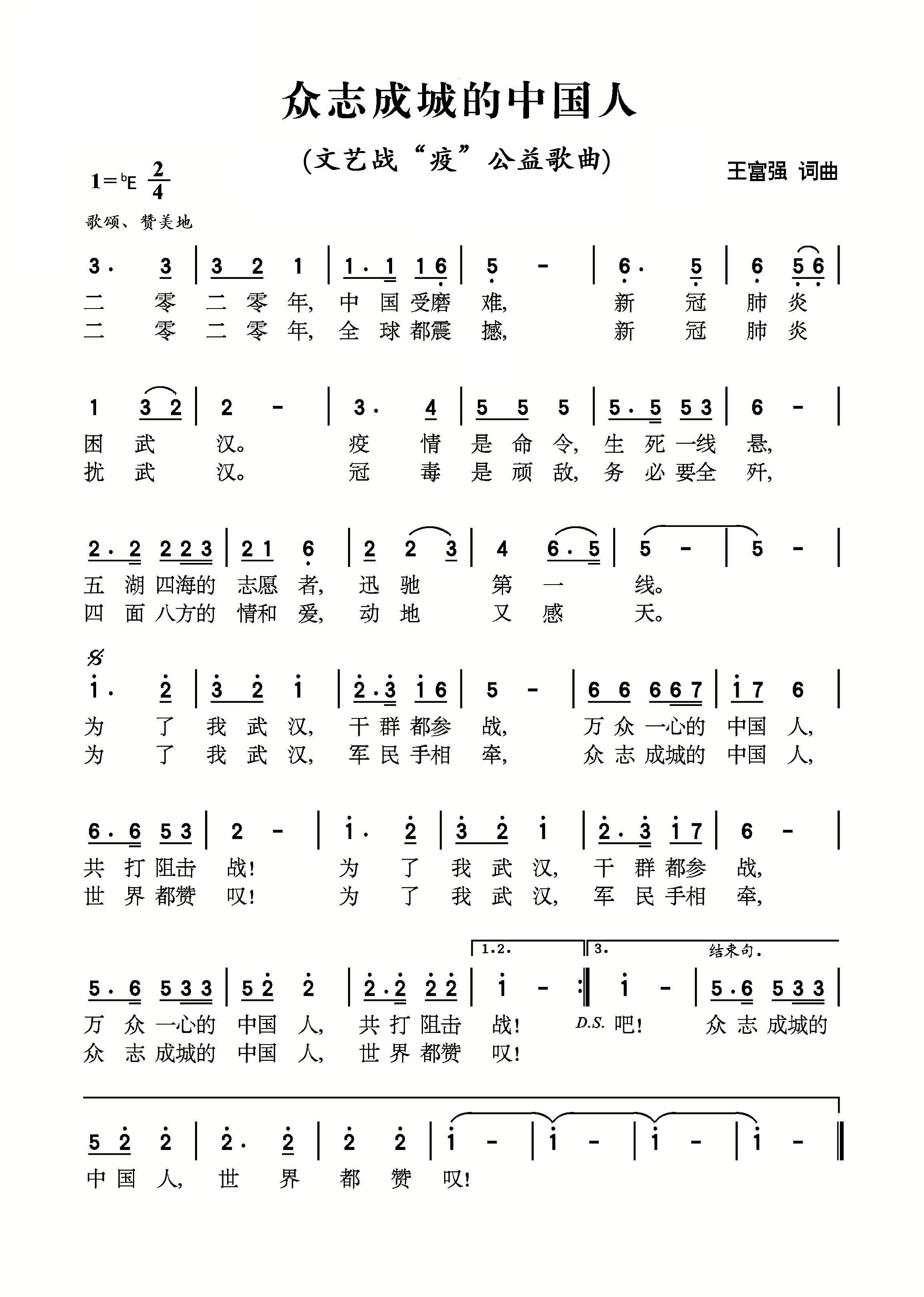 71歲的老音樂人吳榮安先生評價說:《眾志成城的中國人》以飽滿的政治熱情,完美的藝術形式,開闊豪邁的音樂語言,展現了萬眾一心的中國人在疫情面前強大的凝聚力以及不畏艱險,眾志成城,共克時艱,軍民攜手共打疫情阻擊戰,必將取得讓世界都讚歎的最後勝利。王富強先生為決勝戰「疫」譜寫了一曲動人心魄、感人肺腑的史詩篇章。這是一首歌詞、音樂、情懷與歌者完美結合的經典之作,歌中的每一個字,每一個音符都浸潤着他的情感。明快果斷的旋律,鏗鏘有力的節奏與感人肺腑的歌詞互相交織,融為一體。隨着旋律的展開,雄壯有力的進行曲烘托出堅定的氣勢,曲調推波助瀾般地從平緩推向高昂,轉折自然而不失奔放。曲調鐵宕起伏,情感表達浪飛濤涌,很符合歌曲的內涵。最後的結束句很有特點,不斷重複的節奏型在和諧渾厚豪邁的音響中結束,極富推動感染力和號召力。這首歌堪稱新時代精神的戰歌,必將唱響祖國的大江南北!(梅超)