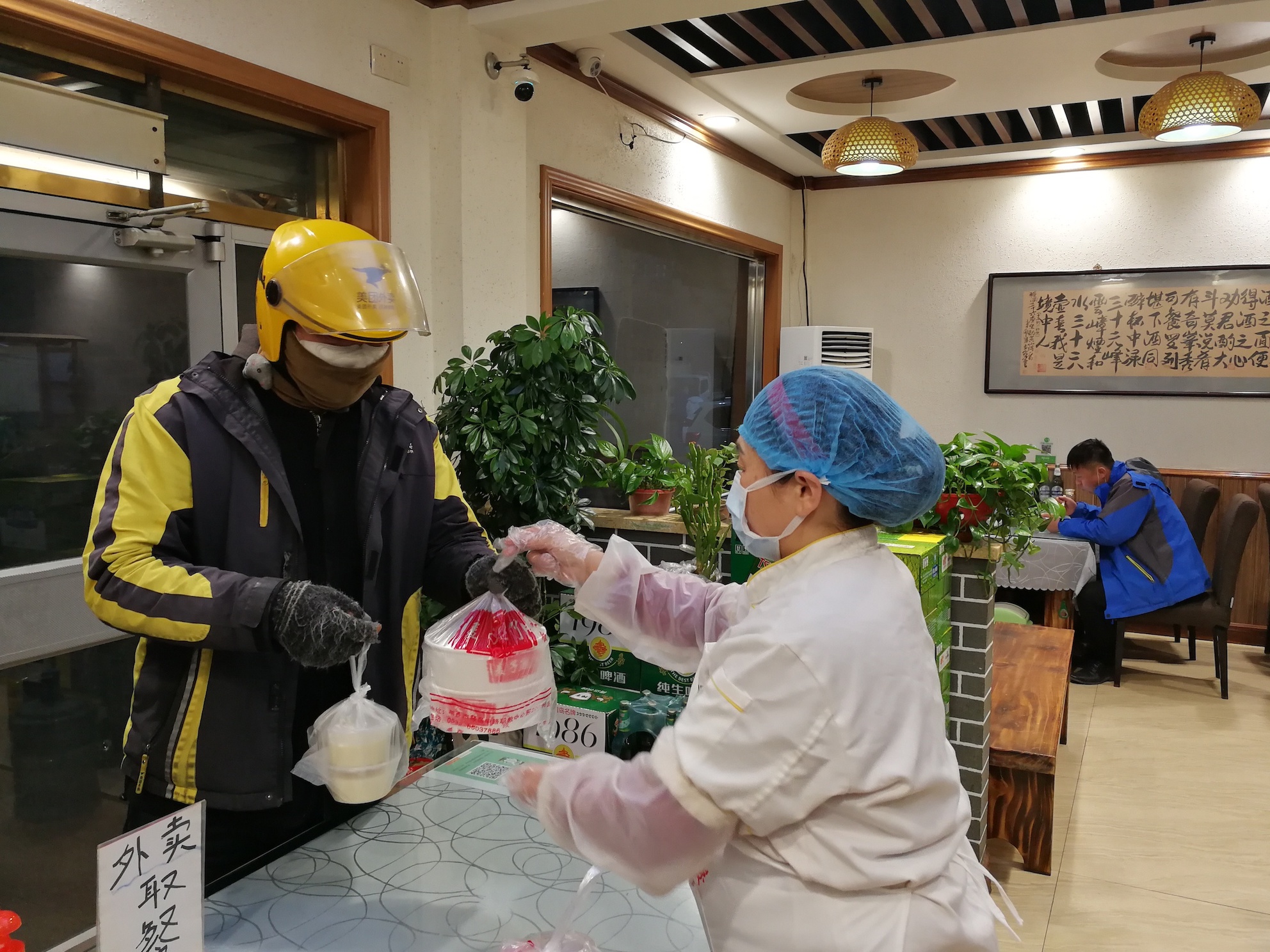 外賣小哥在水餃店門口取餐 周鈺翔摄