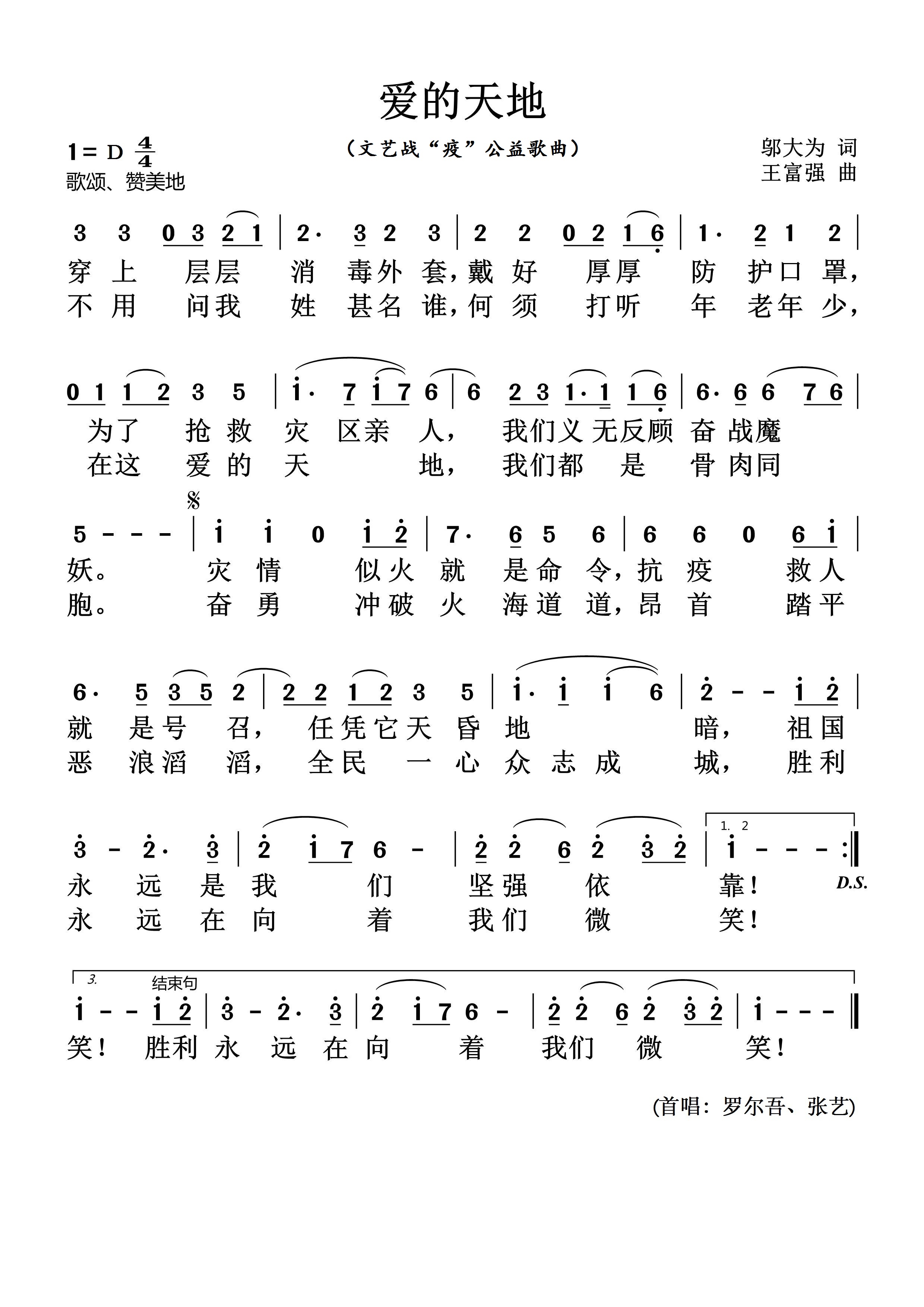 疫情爆發後,宅在瀋陽的鄔大為先生與宅在成都的王富強先生互通電話,互致問候。王富強向鄔大為老師報告,他宅家並沒閑着,已醞釀了一系列文藝戰「疫」主題的文藝作品,剛剛殺青了一組文藝戰「疫」公益歌曲。鄔大為先生告訴王富強,他宅家亦創作了不少戰「疫」主題的詩文作品,剛剛寫成一首戰「疫」歌詞《愛的天地》,並在電話那頭誦給王富強聽。當即,王富強請鄔老師把歌詞發給他。當天,這首謳歌祖國、禮讚大愛、助力戰「疫」的《愛的天地》就這樣誕生了。