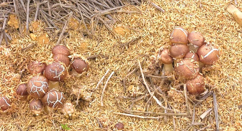 走進大球蓋菇試種基地,一個個大小不一形如小傘的“菇娃娃”從稻草下探出頭來十分可愛,菌柄嫩白飽滿,村民們正拿著籃子進行採摘。合肥學院生物食品與環境學院教授陳群則忙著叮囑公司總經理方秀全管護要領:“要特別注意管理不及時、採收不及時問題,你看,它這個程度已經開始出菇了,現在就是要做好水的管理。長蘑菇的時候一定要潮一些,而且水分跟上以後它的產量也跟著起來了,”