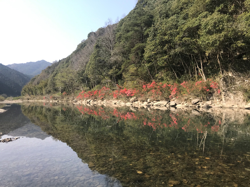 新安江休寧縣流口段的兩岸,數之不清的映山紅競相綻放