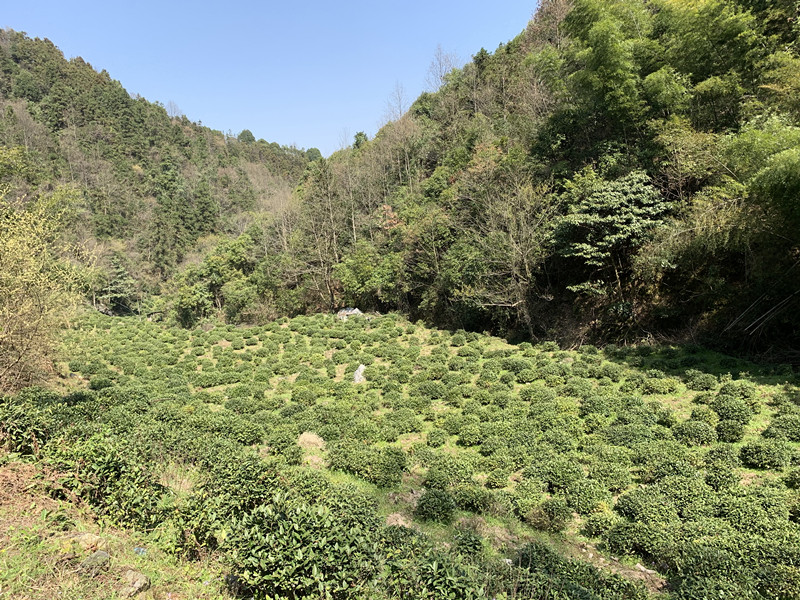 幾位茶工正在茶園裏勞作,正在鋤草的茶工胡旅相認真地將鋤好的草堆在茶樹下,“不用另外施肥,這些雜草是天然肥還能保溫。”走近茶樹,毛峰的芽已吐出嫩綠色的葉尖,預計3月底或4月初可以開園採摘。程彥儒指著嫩芽下麵的老葉片上的蟲子對我們說,這裏的生態茶全部不打一滴農藥。茶園里間或種植了一些黃色的野生香蘭,空氣裏透著淡淡的香味,深呼吸是春天裏百花百果的氣息。葉上有蟲,雜草為肥,園中有花,茶樹與花、草、古樹、蟲共生,好一幅純天然的茶園景觀。拋棄鋤草劑、農藥、化肥,採用自然農法,茶樹與自然融為一體,既提升了茶葉品質又保護了生態。