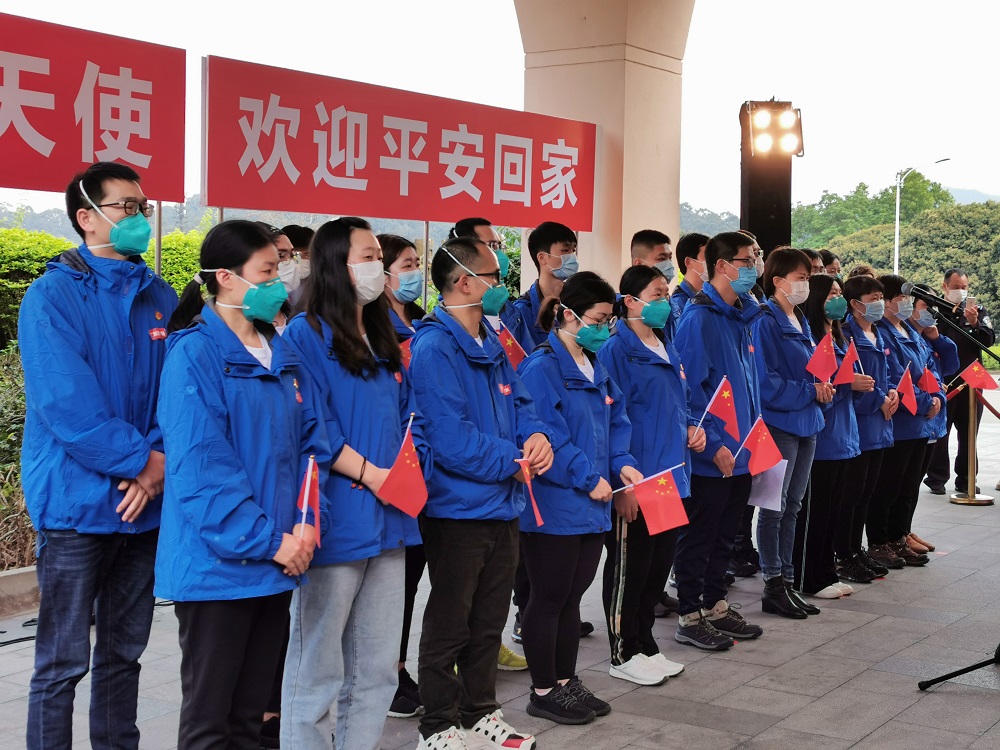 【香港商報網訊】記者 冷運軍 報導:時下正是木棉花盛開,22日,廣東省東莞市首批援助湖北醫療隊共21名醫護人員順利返回東莞,「出征」54天,共收治患者189例,且實現「零感染」。當天東莞以迎接英雄凱旋般的禮遇迎接醫護人員回家,東莞市委書記梁維東迎接醫療隊員時表示,首批醫療隊員最早出發,最晚回來,堅守到最後,圓滿完成醫療救助任務,平安歸來,歡迎回家。