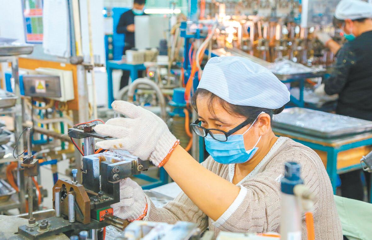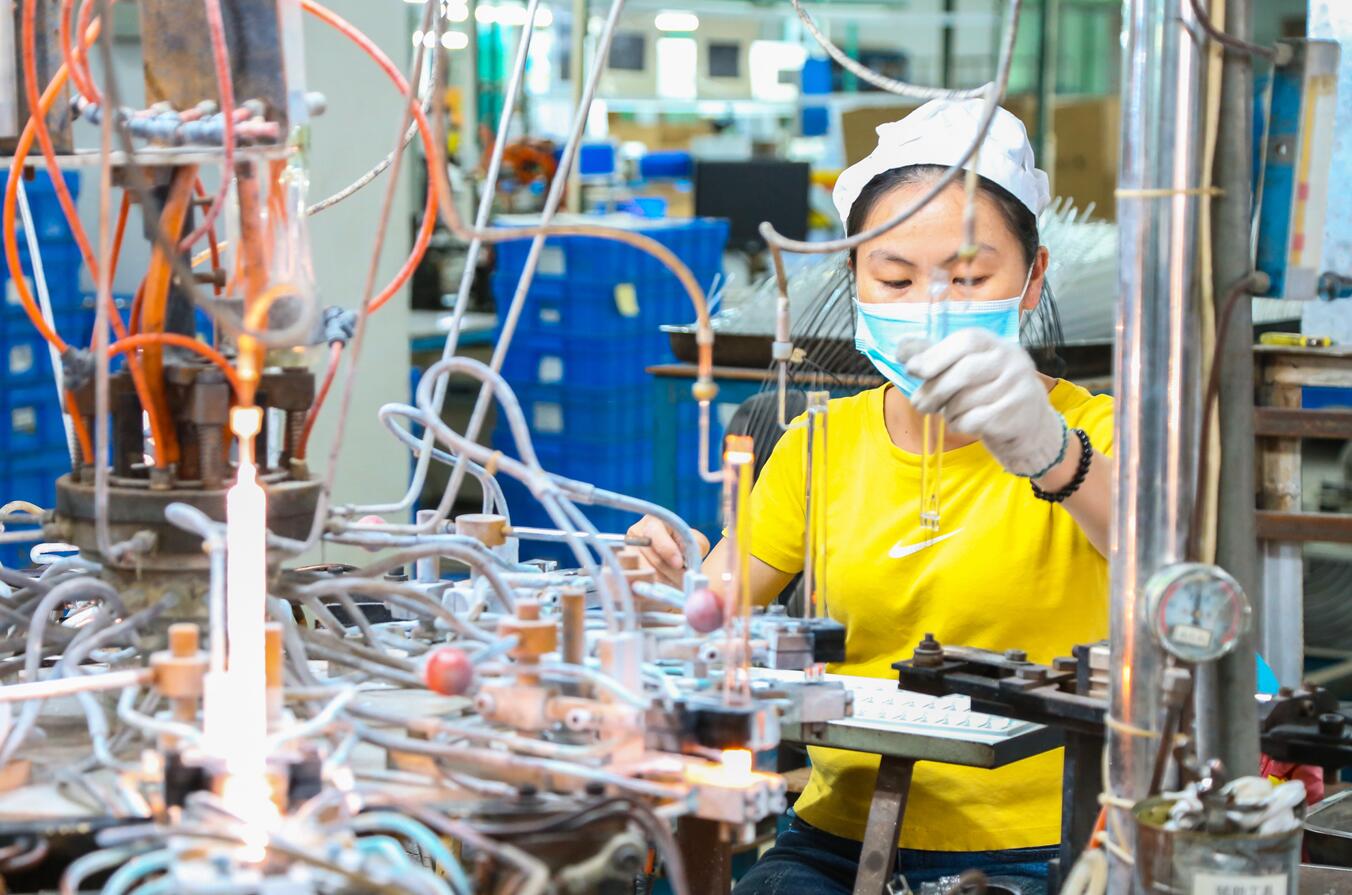 來自四川的杜秀梅是生產線上有着10多年經驗的「老兵」。「我2月9日就回來上班了,目前紫外線殺菌燈生產需求仍舊很大,我主要負責燈絲安裝、玻管夾封等工序,每天都在加班加點生產。」杜秀梅說。
