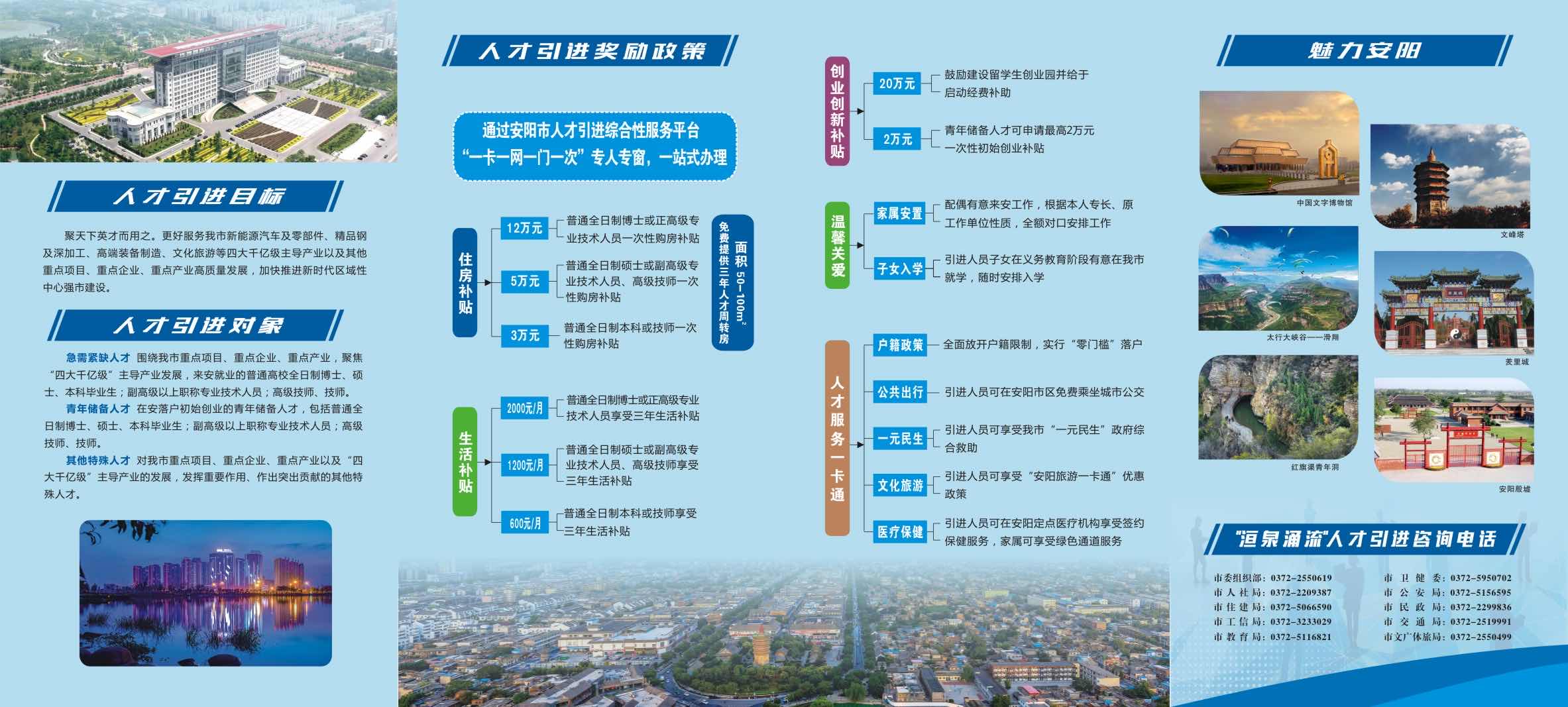 此外,在落戶政策方面,實行「零門檻」,高校畢業生、職業(技工)院校畢業生、留學歸國人員和技能人才來安即可辦理落戶手續。在家屬安置方面,對引進到安陽市企業工作的普通全日制博士和正高級職稱專業技術人員,其配偶有意向來安工作的,根據本人專長、原工作單位性質等情況,全部對口安排工作。在子女教育方面,對引進人才子女在義務教育階段且有意願在安陽就學的,按照有關政策,隨時安排入學。在職稱評定方面,對引進人才給予優先評聘等政策傾斜。