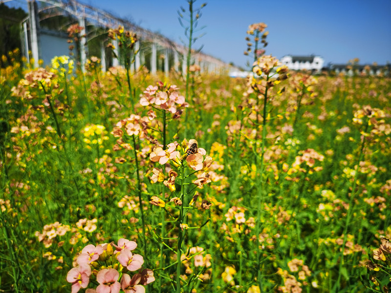 與人們常見的滿目金黃的油菜花海不同,在這裏,油菜花除了黃色,還有白色、粉色等五彩的顏色,通過引進新品種,耕雲穀內油菜花的花期得到延長,也增強了觀賞的趣味性。“我們通過中科院引進了這四個品種的彩色油菜花,它的觀賞價值比較高,同時花期要比普通的油菜花時間要長一個禮拜到十天。”黎陽鎮新江村支委委員程年紅介紹道。