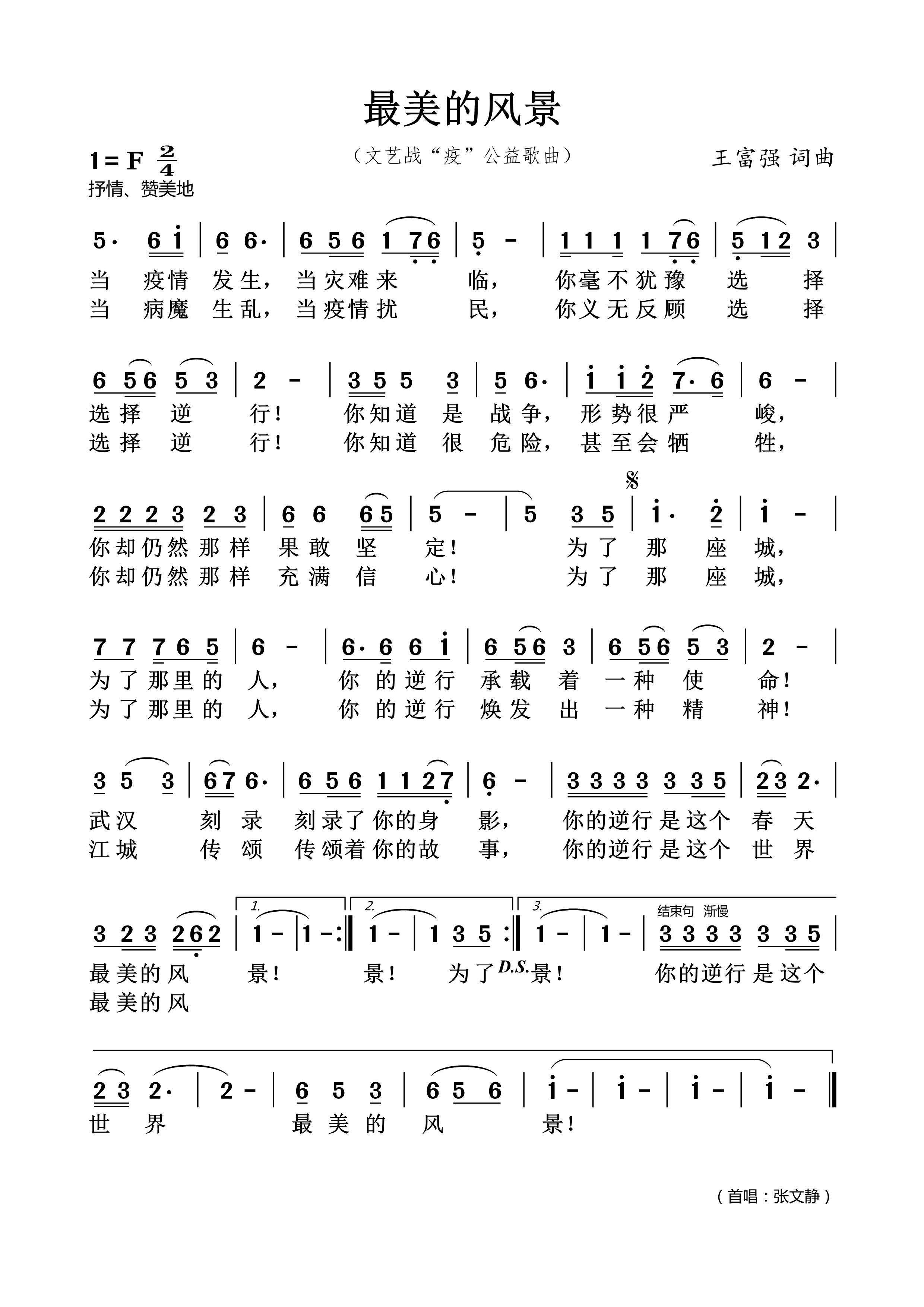 張文靜說:「一個偶然的機會,我在微信群里欣賞到了一首旋律優美情感真摯的歌曲《恰好》(瞿琮詞,王富強曲,劉桐唱),這首歌的詞曲深深地吸引了我,觸動了我的心靈,我情不自禁地為這首歌點贊!『恰好你來,恰好我在,恰好那一天春暖花開……』當時一聽到這首歌,就好期望有機會能認識王富強老師並敬請她為我量身創作一首歌!《恰好》就這樣讓我與著名歌曲作家王富強老師結緣了!當我閱覽到王富強老師作詞並作曲的這首戰『疫』主題的公益歌曲《最美的風景》詞曲時,一下就被作品深刻的主題、意象的塑造、平實的表達吸引住了。一哼,旋律優美,朗朗上口,非常打動人心。短短几遍學唱後,歌詞、旋律便牢牢地印在了我的心裏。『為了那座城,為了那裡的人,你的逆行承載着一種使命……』作品歌頌了全國人民團結一心抗擊疫情的家國情懷。我內心被逆行者們平凡而偉大的無私、勇敢的奉獻精神震撼了!作為一名文藝戰士,特殊時期的責任和使命,我決心認真演繹好這首意義非同一般的戰『疫』作品,將這首傳遞溫暖、傳播大愛的作品獻給戰鬥在抗疫第一線的工作人員,為武漢加油!為祖國加油!」