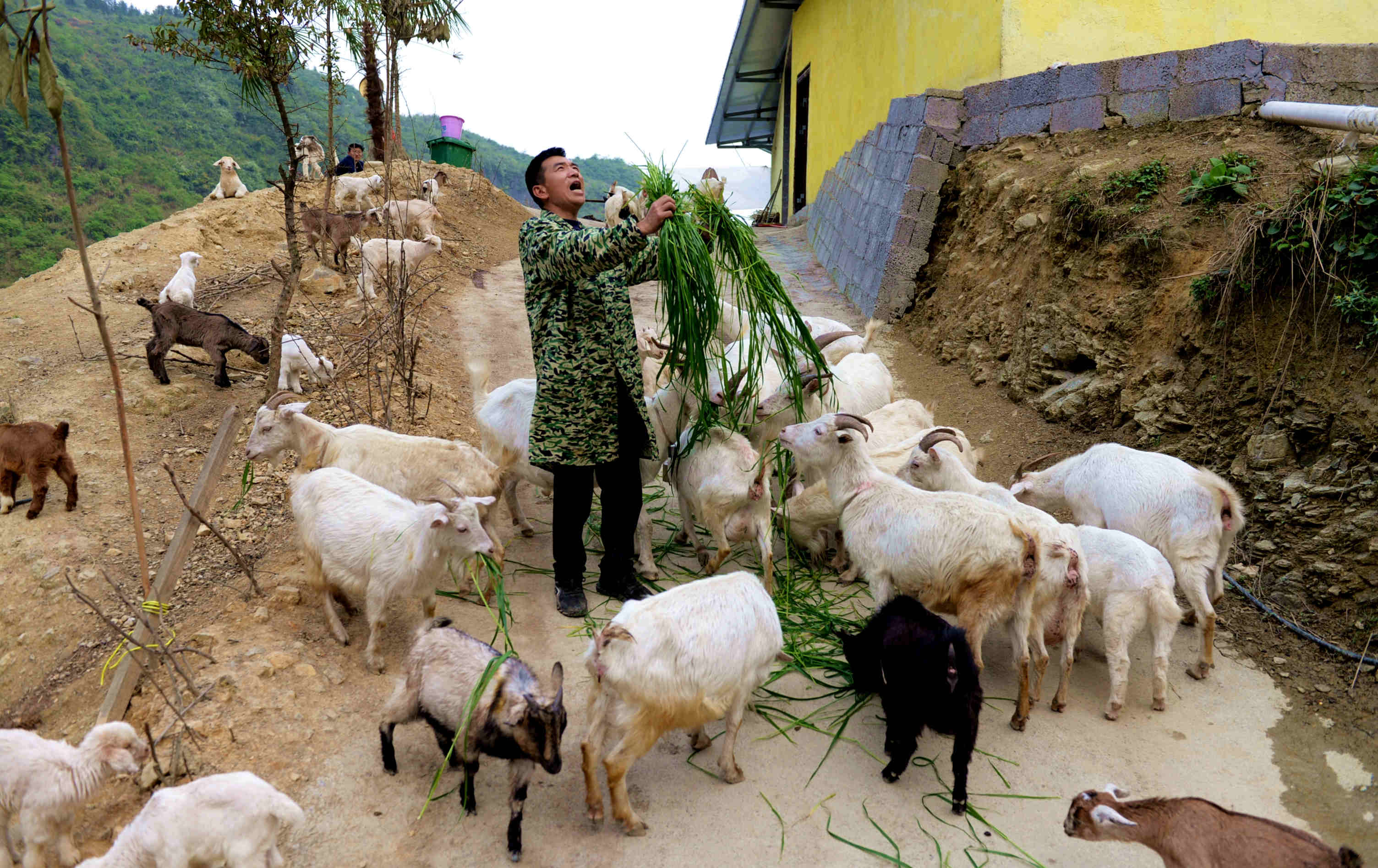 在客田社區白山羊養殖戶馮玉軍的基地內,隨着一陣陣吆喝聲,山羊聞聲而動跑回欄,開始了一天最高興的時刻—加餐。
