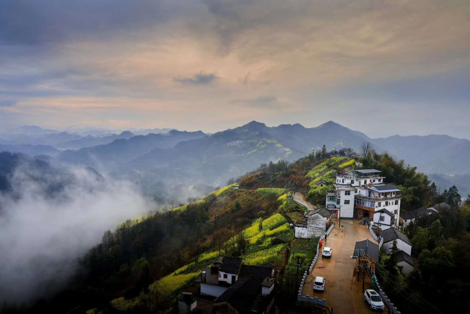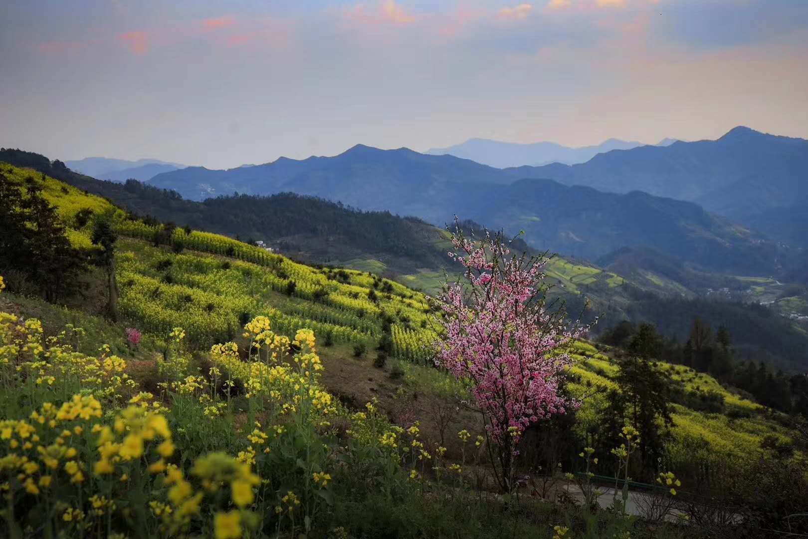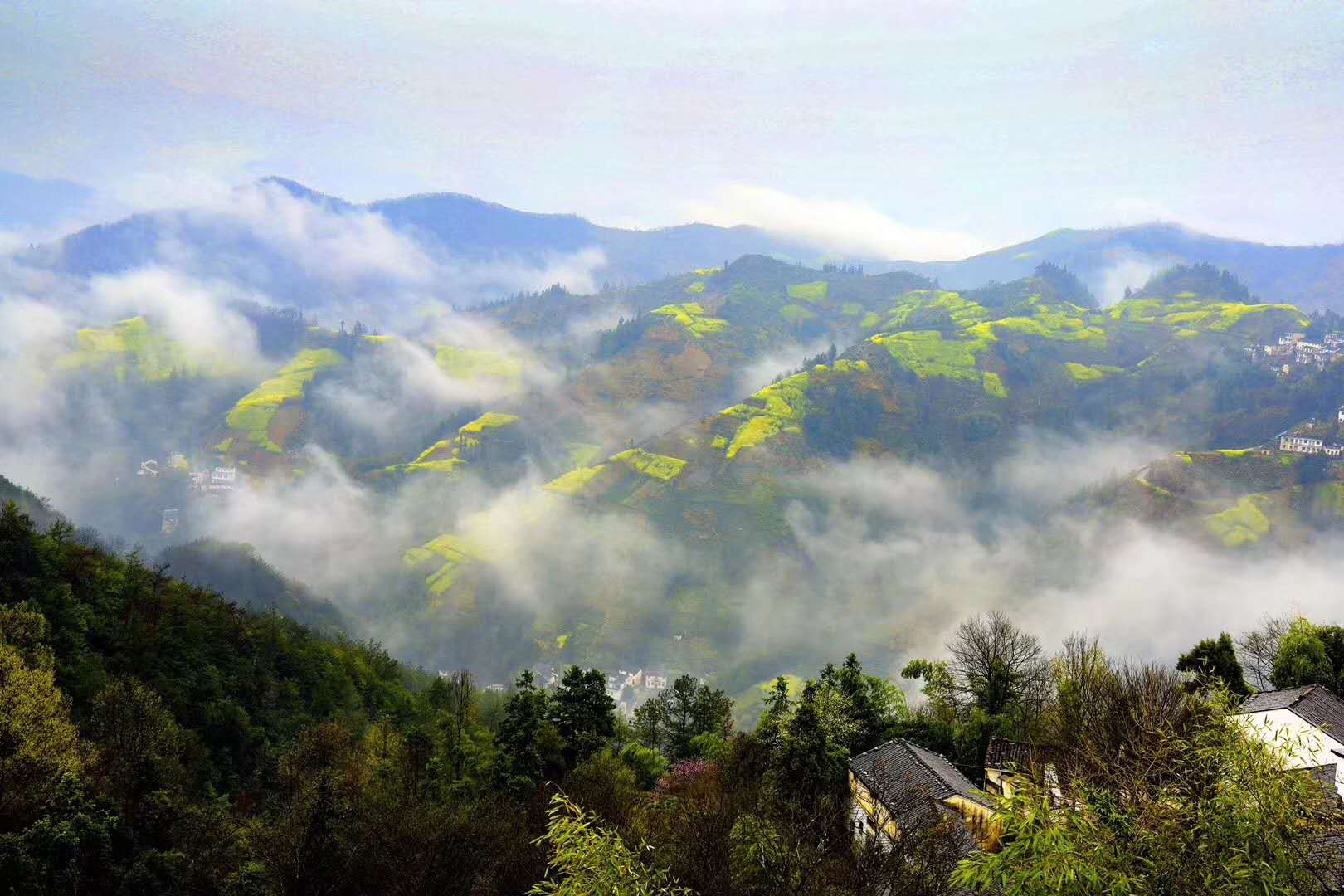 這時節,油菜田依山勢次第而上,富於層次感,映襯著藍天、青山和山間粉牆灰瓦的徽派小村莊,自然入畫。令人心醉神迷,流連忘返。