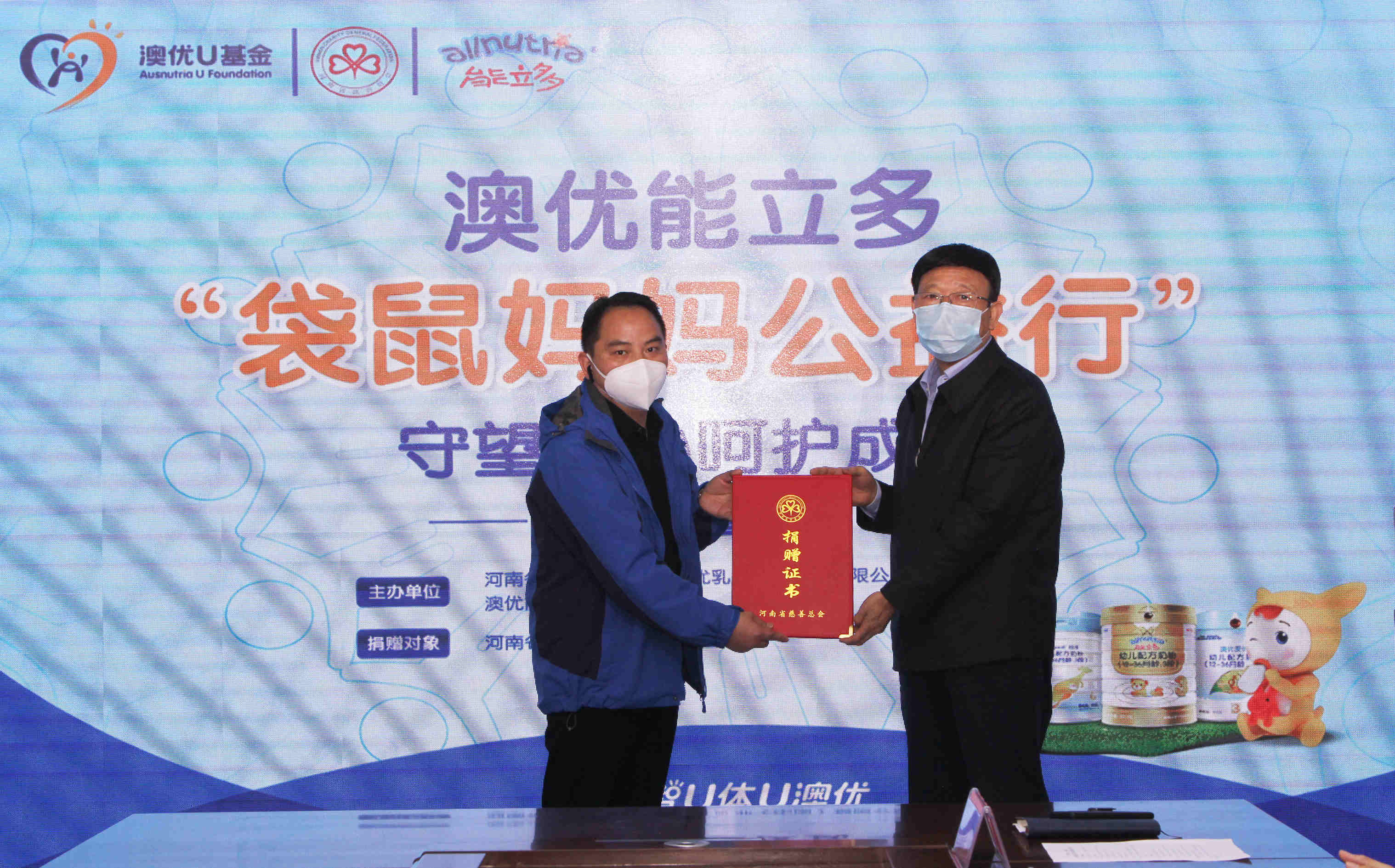 在儀式上,澳優乳業(中國)有限公司向河南省慈善總會捐贈了2190箱、總價值523萬元的嬰幼兒配方奶粉,定向幫扶鄭州市兒童福利院等河南省19家福利院的困境兒童。盛國民代表河南省慈善總會接受捐贈並向愛心企業澳優乳業(中國)有限公司頒發捐贈證書。