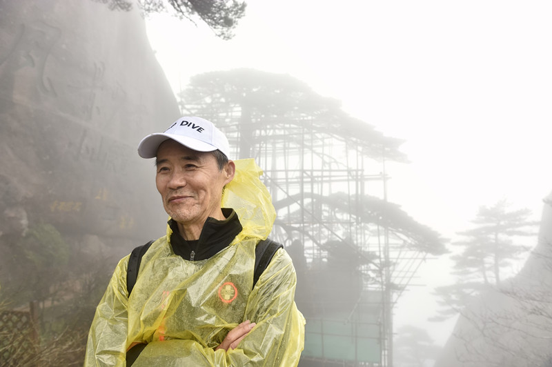 在迎客松前,隨行人員已經累得氣喘吁吁了,王石笑著說:“我腦門還沒有發熱,還沒進入狀態呢”。看到大家半信半疑的樣子,王石兩手一攤,點點頭,認真地說:“真的!”