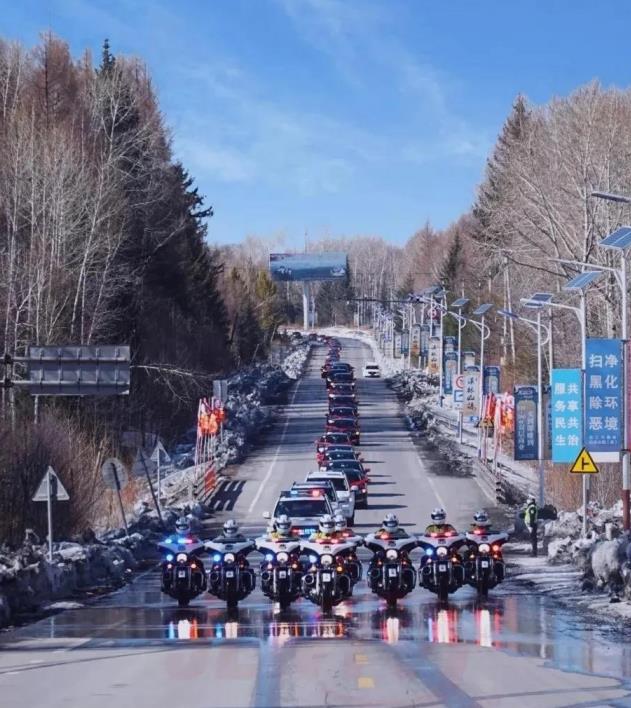 引導車和騎警護衛135輛紅旗轎車駛向集中休整點 圖吉林新聞聯播