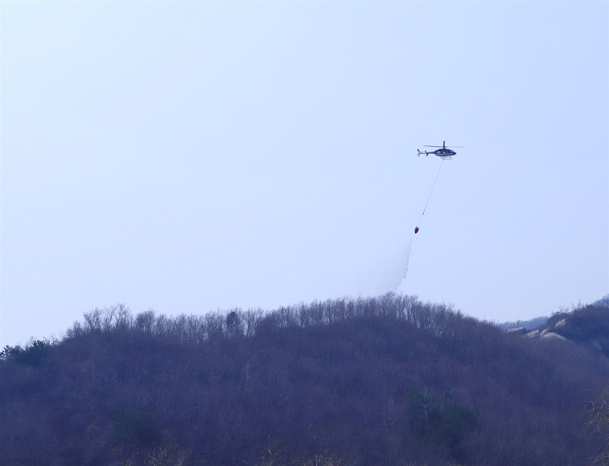 就在14支森林滅火隊伍分別到達演練地點奮力撲火的時候,又出現了「火勢增大」的情境,此時對講機里傳來「啟動直升機滅火」的指令。伴隨着螺旋槳的嗡鳴聲,一架直升飛機就近取水,攜帶吊桶快速飛往起火點進行噴洒。直升機多次往返,通過空地兩處的密切配合,協同作戰,近2個小時後「明火撲滅,余火清理完畢」,演練結束。