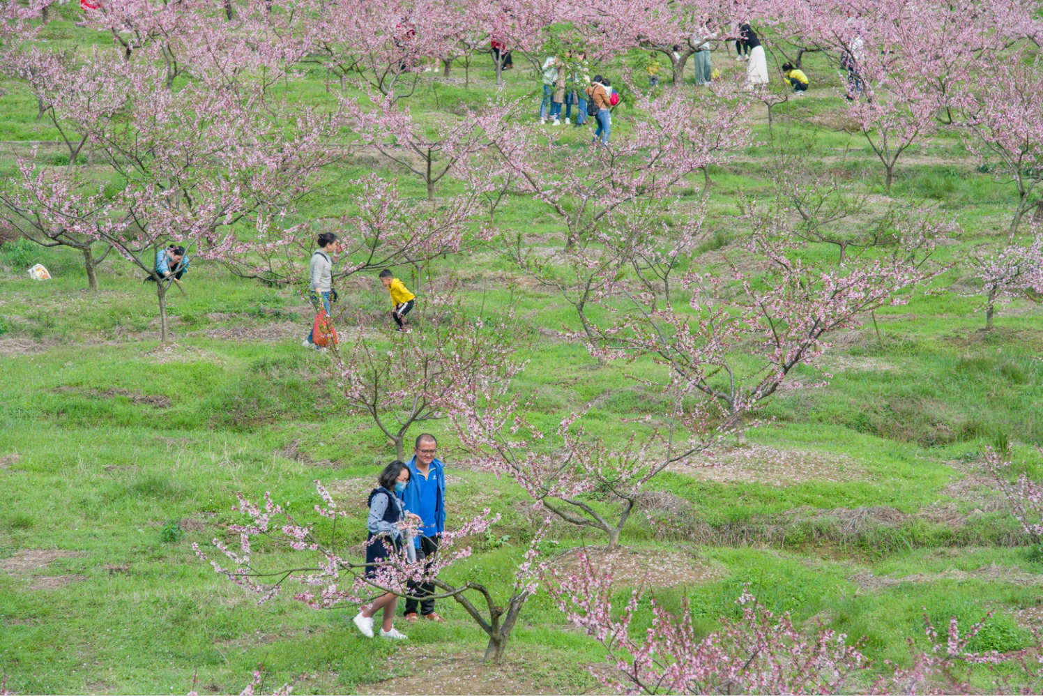 【香港商報網訊】清晨,陽光透過枝丫,連片的緋紅綴滿山野。在江西省遂川縣珠田鄉黃塘村的黃桃基地上,工人們開始分片鋤草,絡繹不絕的遊客趕來奔赴一場桃花之約,用手中鏡頭聚焦春天的歡聲笑語。