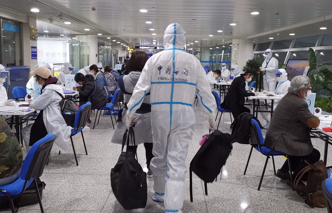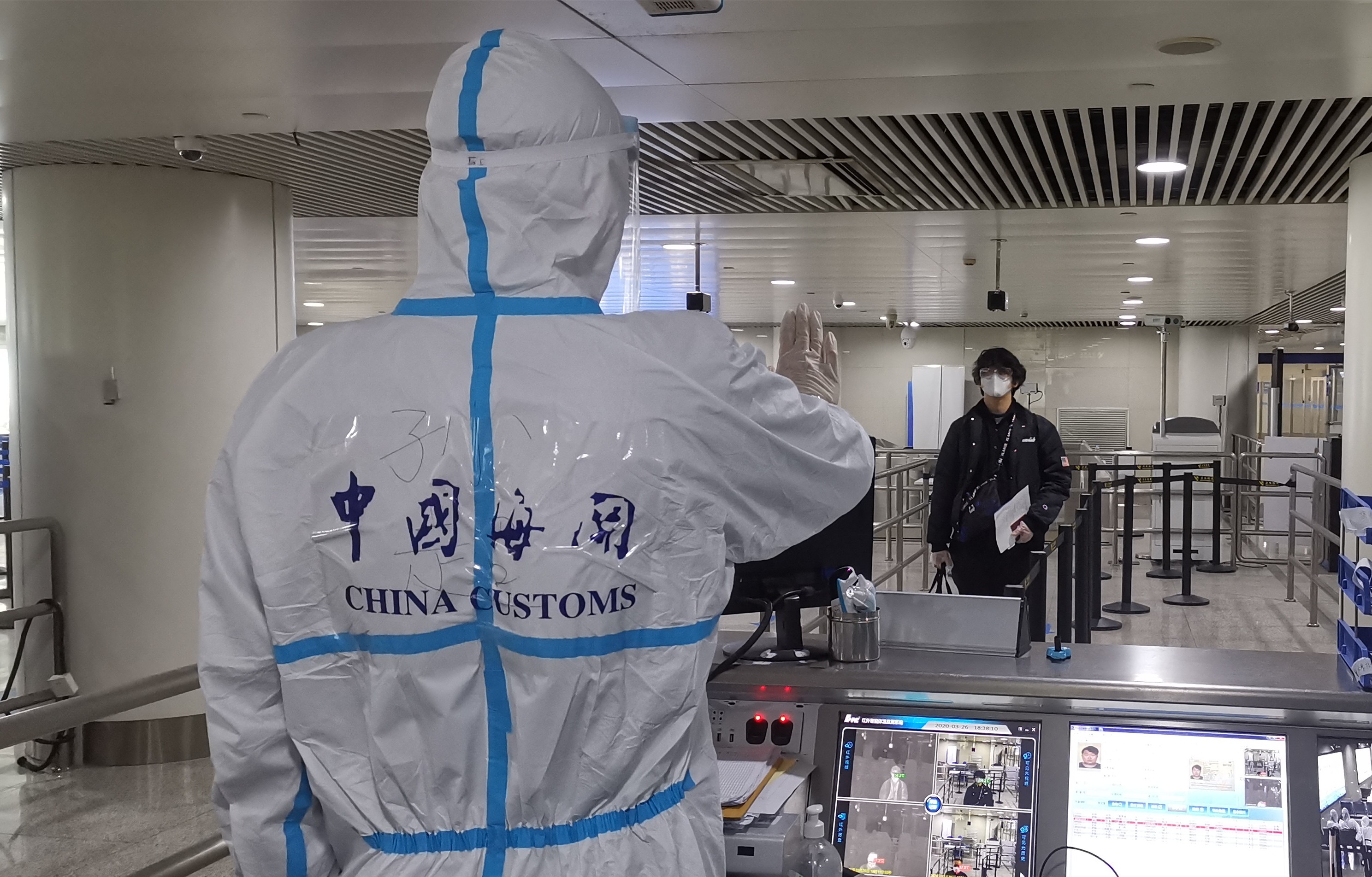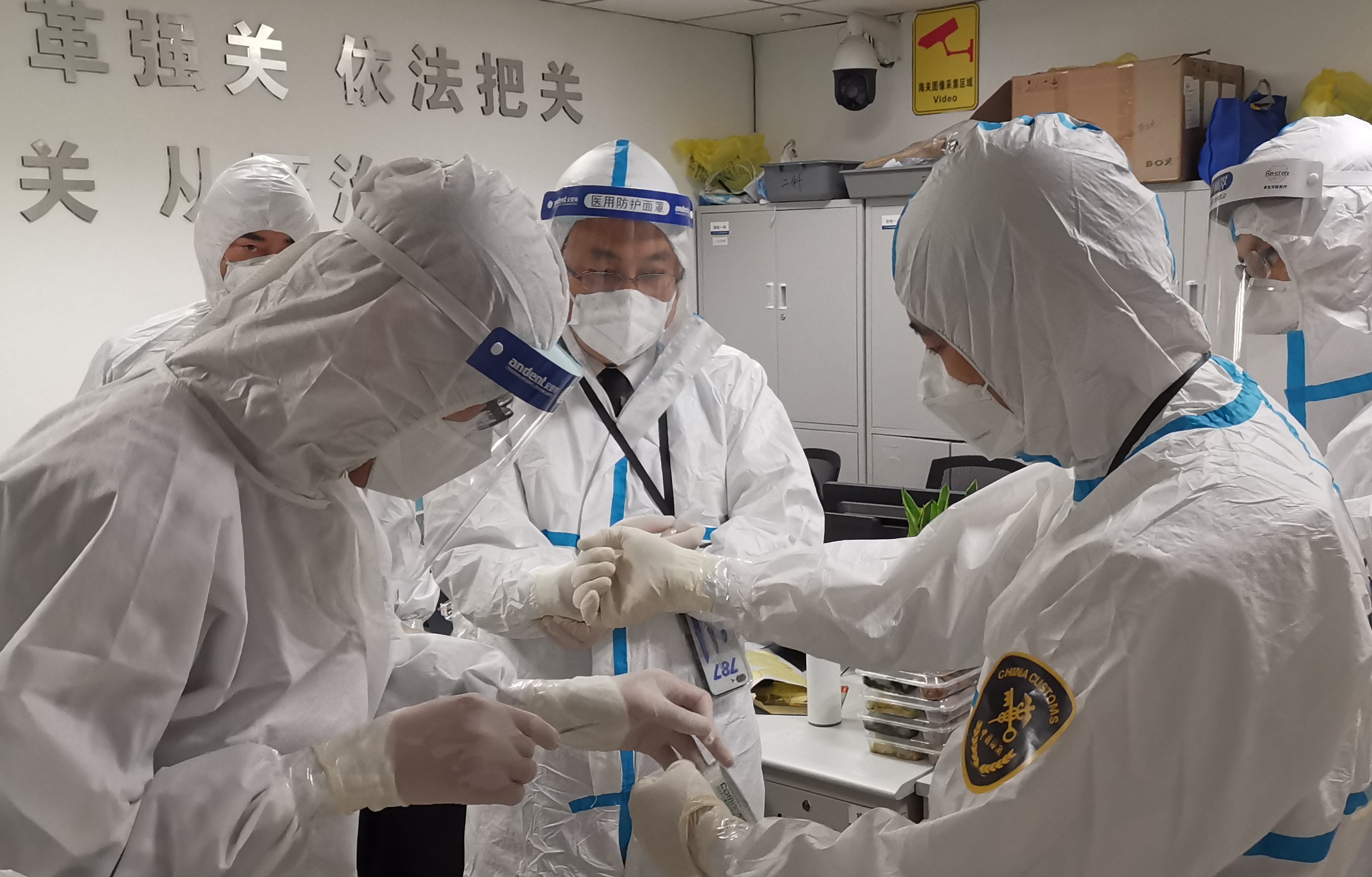 每天一早關員們就要對當天入境的航班和進境旅客進行風險評估,隨着入境航班陸續抵達,緊張的流行病學調查和採樣工作也隨之展開。在疫情高傳染性風險和連續作戰的疲憊面前,駐守在口岸一線的海關關員們堅守職責,通常身着密閉的防護裝備連續6、7個小時無法喝水、進食,也無法去洗手間。