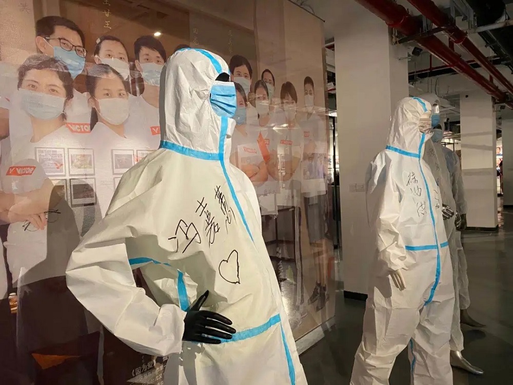 臉戴口罩、身穿防護服的人體模型把觀眾帶入其境