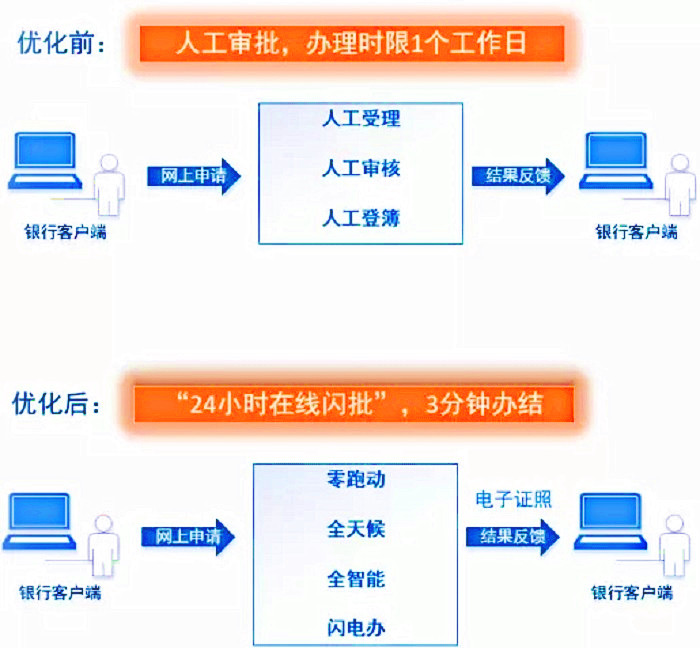 系統依託大數據平台,通過人工智能等技術手段,自動比對、校驗,從受理、審核、登簿全流程無人工參與,實現登記審批「全智能」,在銀行客戶端可實現24小時自助申請,隨時上線申辦,實現登記辦理「全天候」。整個辦理流程所需時間僅為網上系統運轉時間(約為3分鐘),隨即生成電子證照,實現登記流程「閃電辦」。