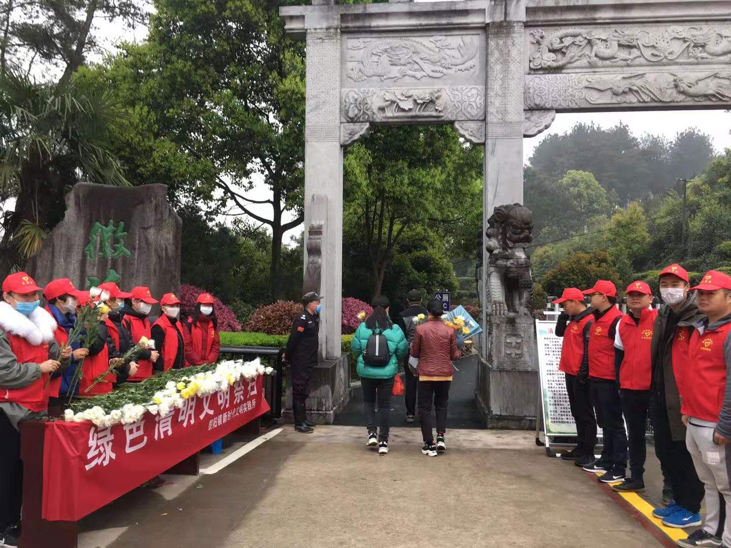 4月4日上午7點30分,屯溪區屯光鎮和黎陽鎮新時代文明實踐所在屯溪徽陵公墓、屯溪靜頤城公墓和屯光鎮南溪南集中安葬點等入口處搭設鮮花兌換臺,設置文明祭祀宣傳橫幅,來自愛心365公益協會、愛湧黃山志願服務隊和城投先鋒驛站志願服務隊的100餘名志願者,身著紅馬甲,手持鮮花,向前來祭掃的市民發放《黃山市文明祭祀倡議書》,宣傳綠色低碳祭掃理念,呼籲市民用手中的煙花爆竹和紙錢兌換鮮花,僅兩個小時,發放倡議書3千份、鮮花1萬束。