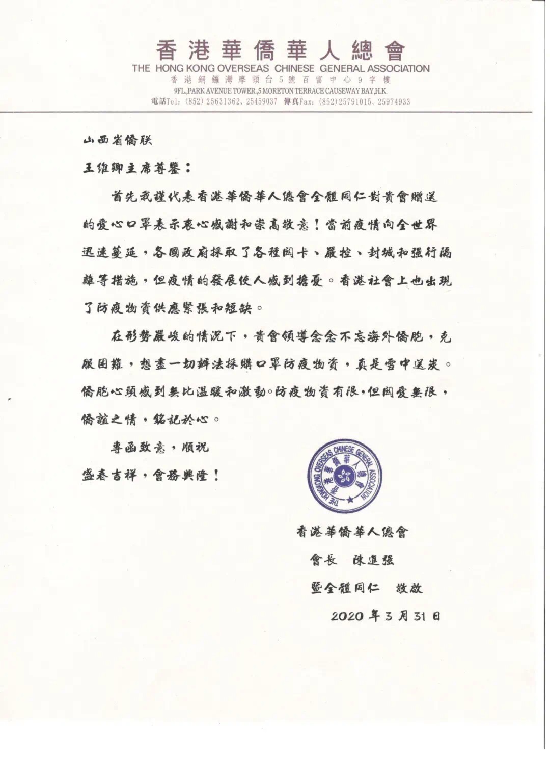 本港華僑華人總會以及美國加州山西商會、多倫多山西同鄉會、英國華人青年人才交流協會、英國考文垂大學、匈牙利山西商會、瑞典斯德哥爾摩華助中心、沙巴馬中聯誼協會、日本山西總商會/日本山西同鄉會等海外僑(社)團紛紛向山西省僑聯發回感謝信: