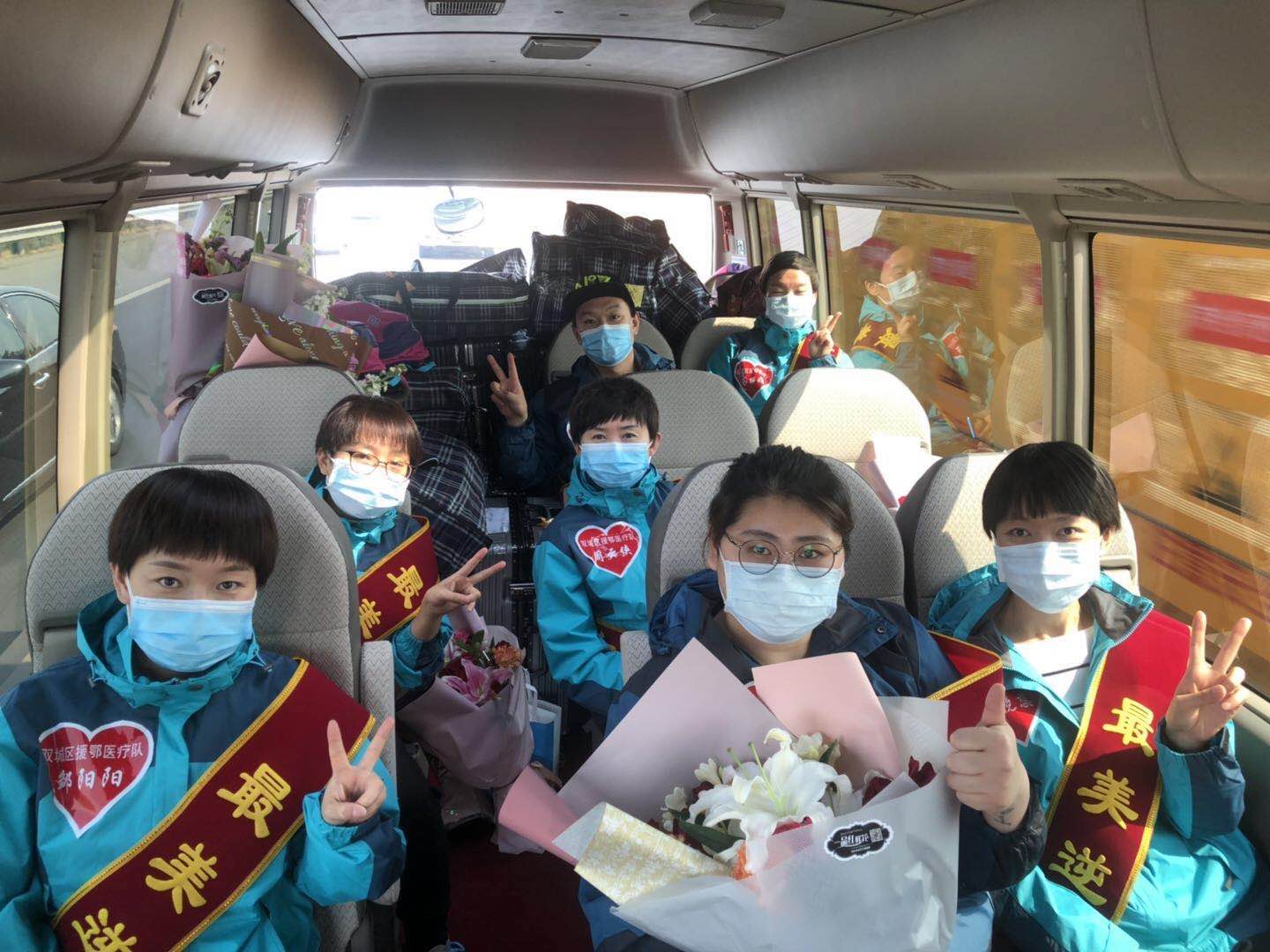 上午10時許,援鄂醫療隊員們乘坐的中巴車緩緩駛出萬豪大酒店,車身懸掛的「向最美逆行者致敬」「千里馳援 攜手抗疫 不辱使命 勝利改選」紅色條幅熠熠生輝,特別引人注目。