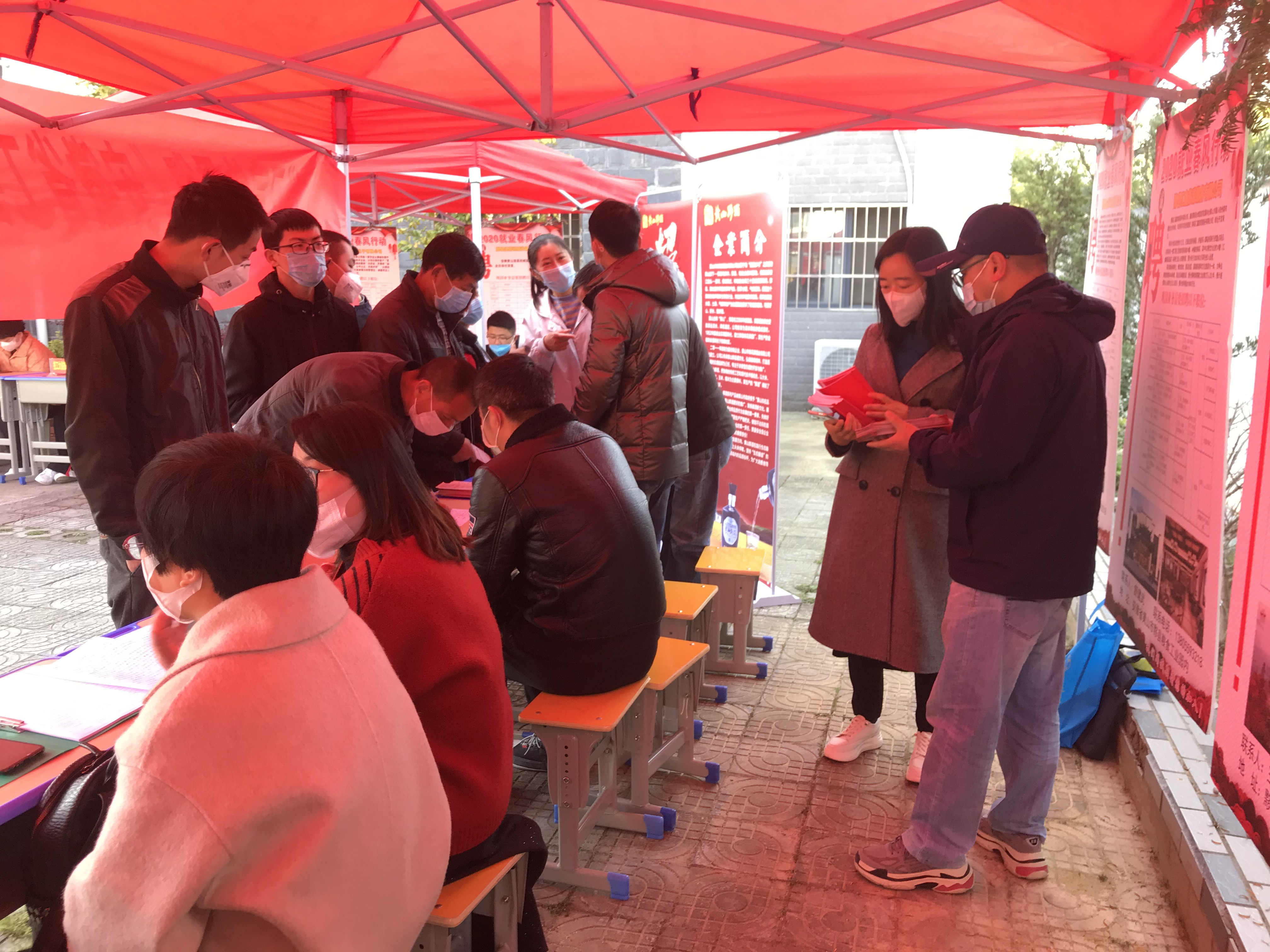 上午8點半,黟縣人力資源市場外排起了長隊,入口處設置了多重“關卡”,求職者在測量體溫、填寫基本資訊、出示安康碼後才能進入招聘會現場,且全程必須佩戴口罩。活動現場有工作人員巡視,提醒求職者保持安全距離,嚴格避免人員聚集、紮堆,確保招聘會有序進行。