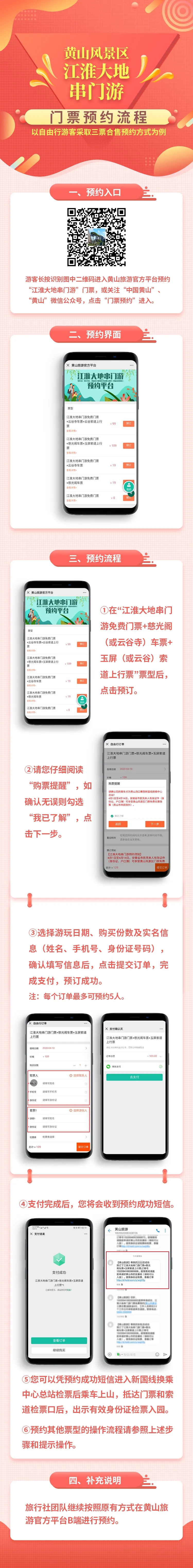 “實施網上預約,旨在進一步暢通景區交通,避免遊客集聚。”按照預約流程,遊客可進入黃山旅遊官方平臺預約“江淮大地串門遊”門票,或關注“中國黃山”“黃山”微信公眾號,點擊“門票預約”進入。預約可選擇遊玩日期、購票份數,並填寫實名資訊,每個訂單最多可預約5人,支付成功後,憑藉預約短信、有效身份證件即可順利入園。