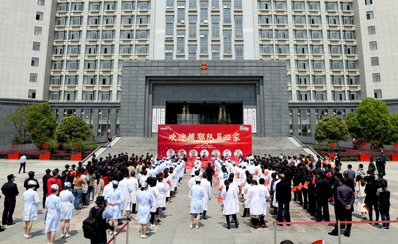 【香港商報網訊】截止4月10日上午,安徽黃山市休寧縣派出的2批援鄂醫療隊7名成員全部平安歸來,家鄉人民舉辦了隆重而熱烈的歡迎儀式。休寧縣委書記盧邦生,縣人大常委會主任汪美月,縣政協主席儲曉華,縣委副書記、統戰部長洪建坤,縣政協副主席、縣總醫院院長寧衛華出席歡迎儀式。