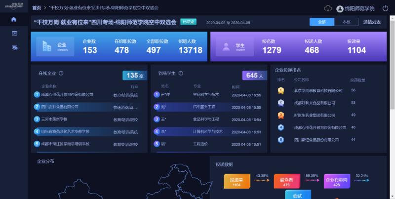 「共青團·千校萬崗」線上招聘會旨在為幫助高校畢業生在疫情防控的特殊時期順利就業,服務國家穩定就業工作大局。此次招聘會通過搭建「雲」平台方式展開,用人單位在線發佈職位通知、查閱簡歷、即時對話,學生投遞簡歷、視頻面試、線上籤約。據悉,招聘會當天共吸引了來自全國各地的153家優質企業,涵蓋教育/培訓、房地產/建築和互聯網/電子商務等行業,較好的結合了高校專業分佈,提供職位497個,招聘需求13718人,共有1278名畢業生通過網絡平台投遞簡歷參加招聘。