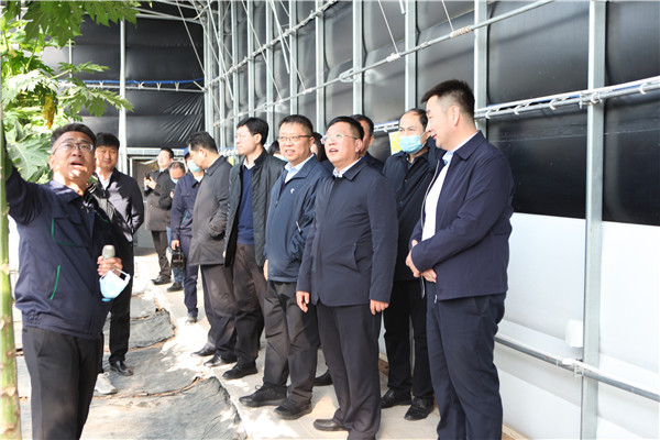 在山西農谷調研時,山西省投資促進局黨組書記、局長楊春權一行走進火龍果園、木瓜園、車厘子園、普羅旺斯番茄園等進行了實地考察。(韓立堃 攝)