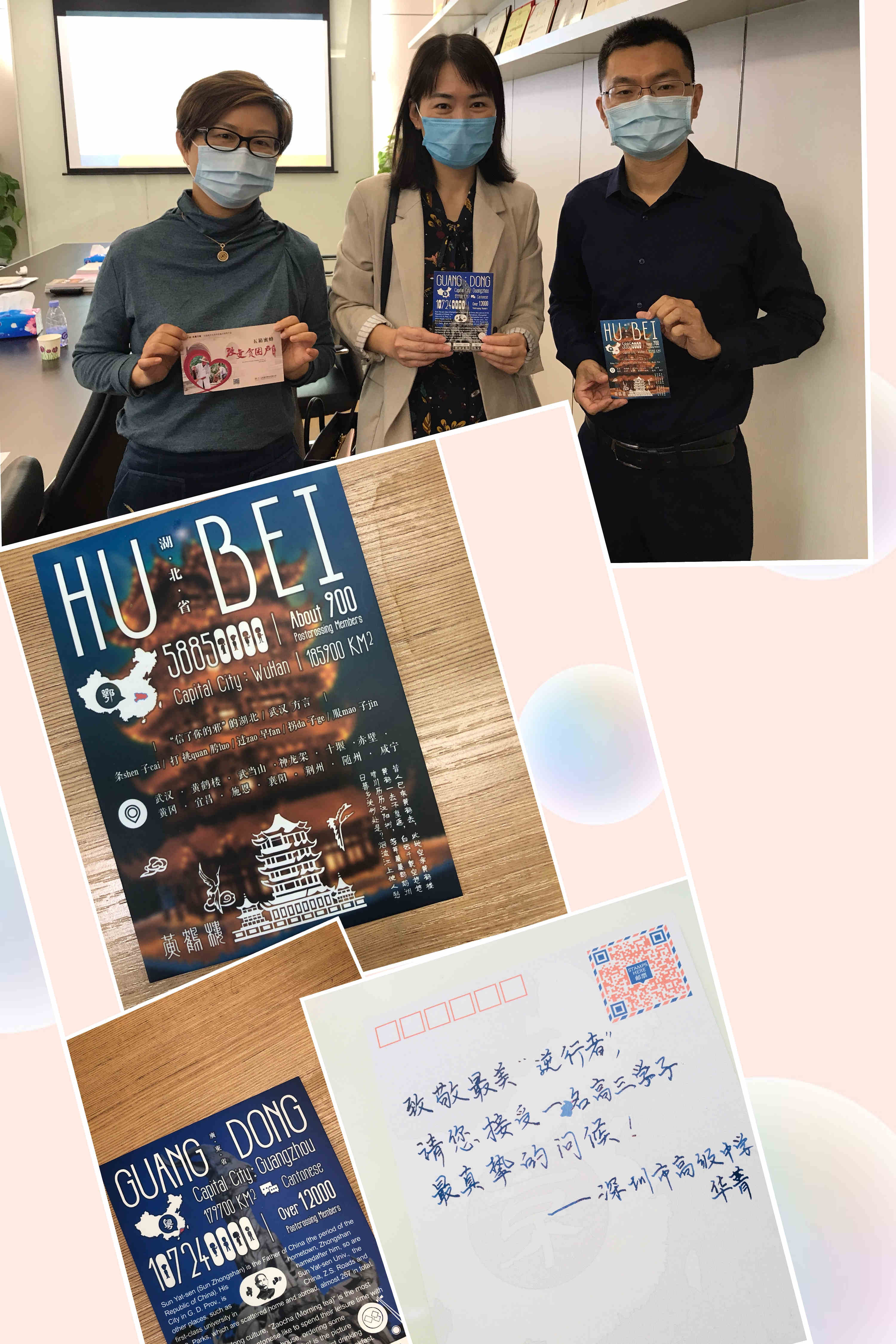 山西善農蜂業有限公司創辦人羅茵(左)為援鄂返深醫療隊送上晉西高原蜂蜜,並代女兒——深圳高級中學高三學生華菁,為援鄂醫護送上祝福卡