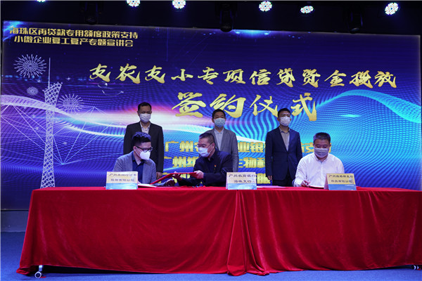【香港商報網訊】記者 黃裕勇 報導:4月16日,廣州市海珠區舉行「再貸款專用額度政策支持小微企業復工復產」專題宣講會,廣州農商銀行和廣州銀行分別與廣東漢威城建有限公司和廣州維格斯生物科技有限公司、廣州亞洲行領帶服飾有限公司現場簽署了融資協議。