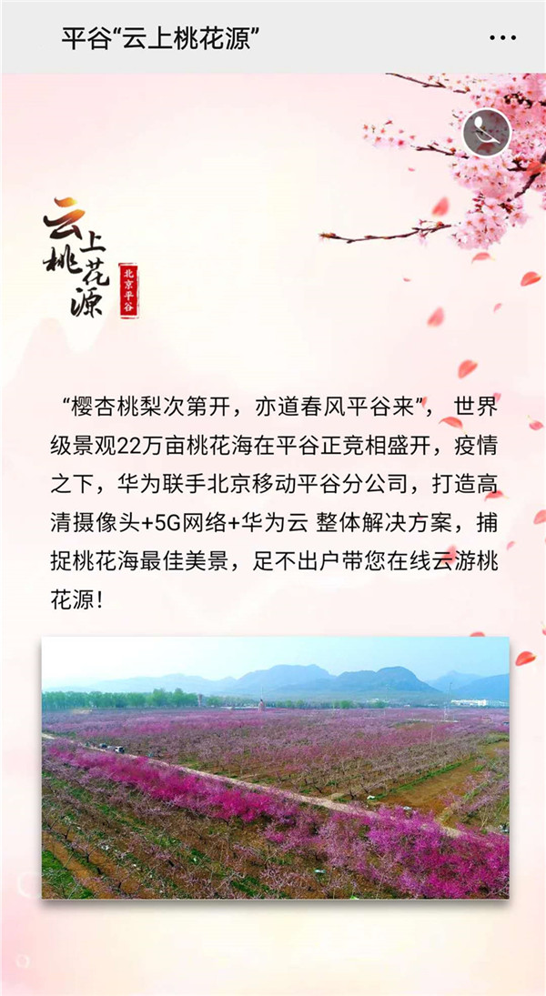 「櫻杏桃梨次第開,亦道春風平谷來"。4月15日,世界級景觀22萬畝桃花海在平谷正競相盛開,北京平谷「雲上桃花源」開播,為了便於疫情期間市民觀賞桃花美景,華為公司聯手北京移動,打造高清攝像頭+5G網絡+華為雲整體解決方案,捕捉桃花海最佳美景,足不出戶帶您在線雲遊桃花源。