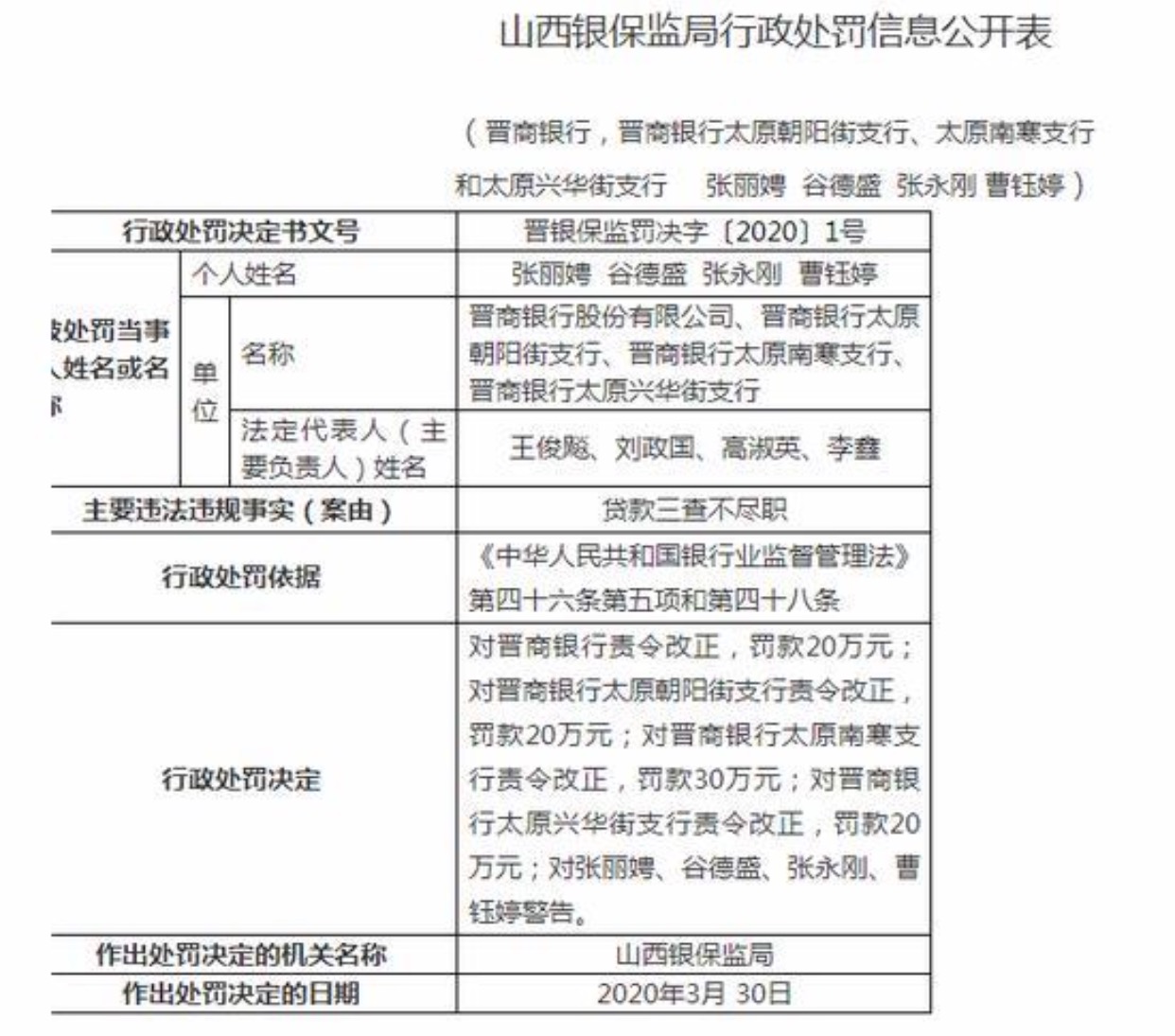 晉商銀行及三家支行因貸款三查不盡職被罰
