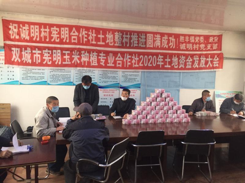 雙城區勝豐鎮誠明村憲明玉米合作社會議室里,長桌上一摞摞的人民幣堆成「金字塔」,總計 500 萬元。村民們都戴着口罩,有序來領取現金。全村村民把土地都承包給合作社統一種植經營,盈利後「土地款」以現金方式發放給村民。憲明玉米種植專業合作社成立於 2013 年,多年來,合作社承包村民的耕地分別嘗試過種植西瓜、馬鈴薯、玉米、高粱等,逐漸發展壯大,並實現了土地規模經營整村推進的跨越。合作社把全村土地都承包下來統一經營。