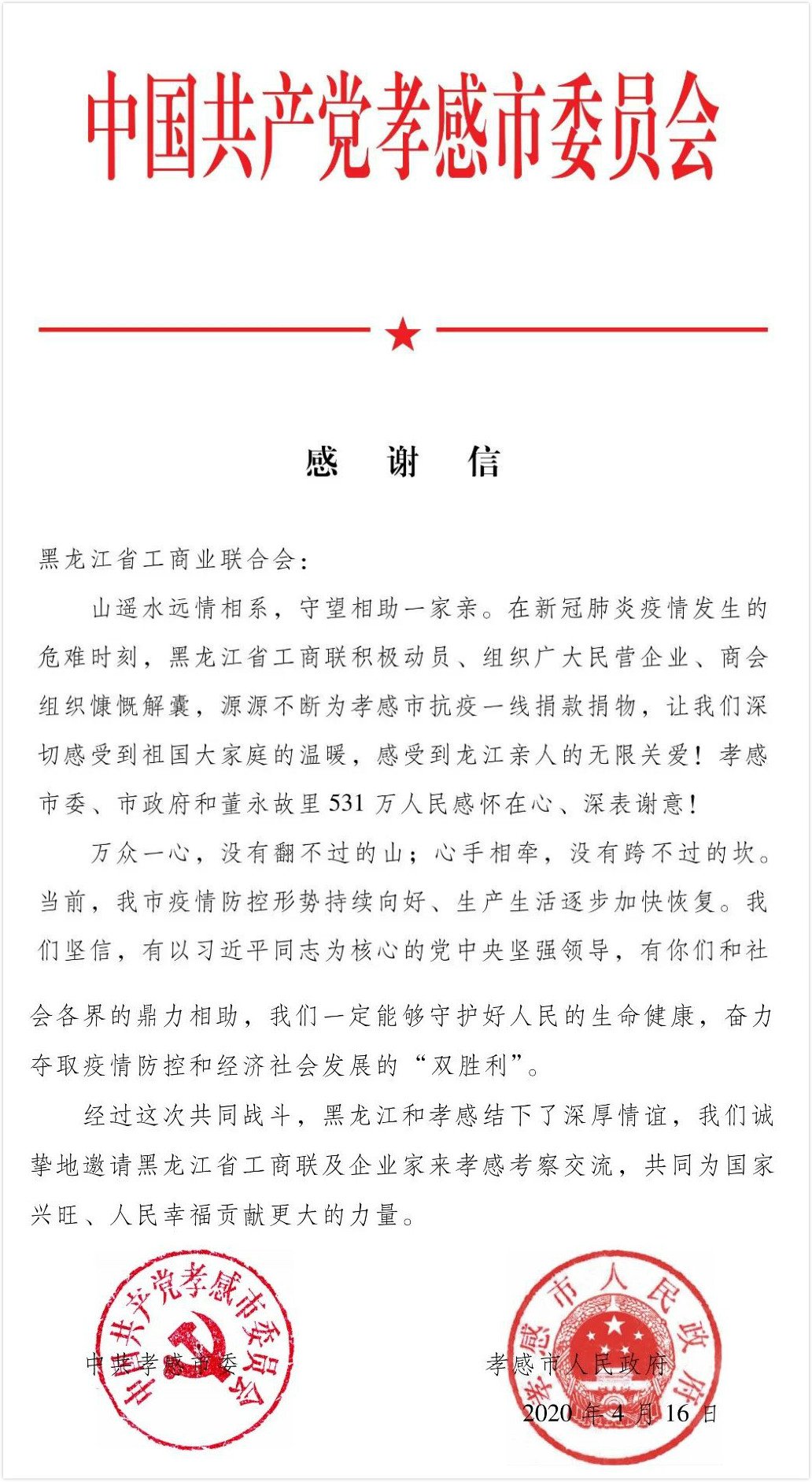 信中還提到,萬眾一心,沒有翻不過的山;心手相牽,沒有跨不過的坎,當前,孝感市疫情防控形勢持續向好,生產生活逐步加快恢復,他們堅信,有以習近平同志為核心的黨中央堅強領導,有社會各界的鼎力相助,孝感一定能夠守護好人民的生命健康,奮力奪取疫情防控和經濟社會發展的「雙勝利」。「經過這次共同戰鬥,黑龍江和孝感結下了深厚情誼,我們誠摯地邀請黑龍江省工商聯及企業家來孝感考察交流,共同為國家興旺,人民幸福貢獻更大的力量。」