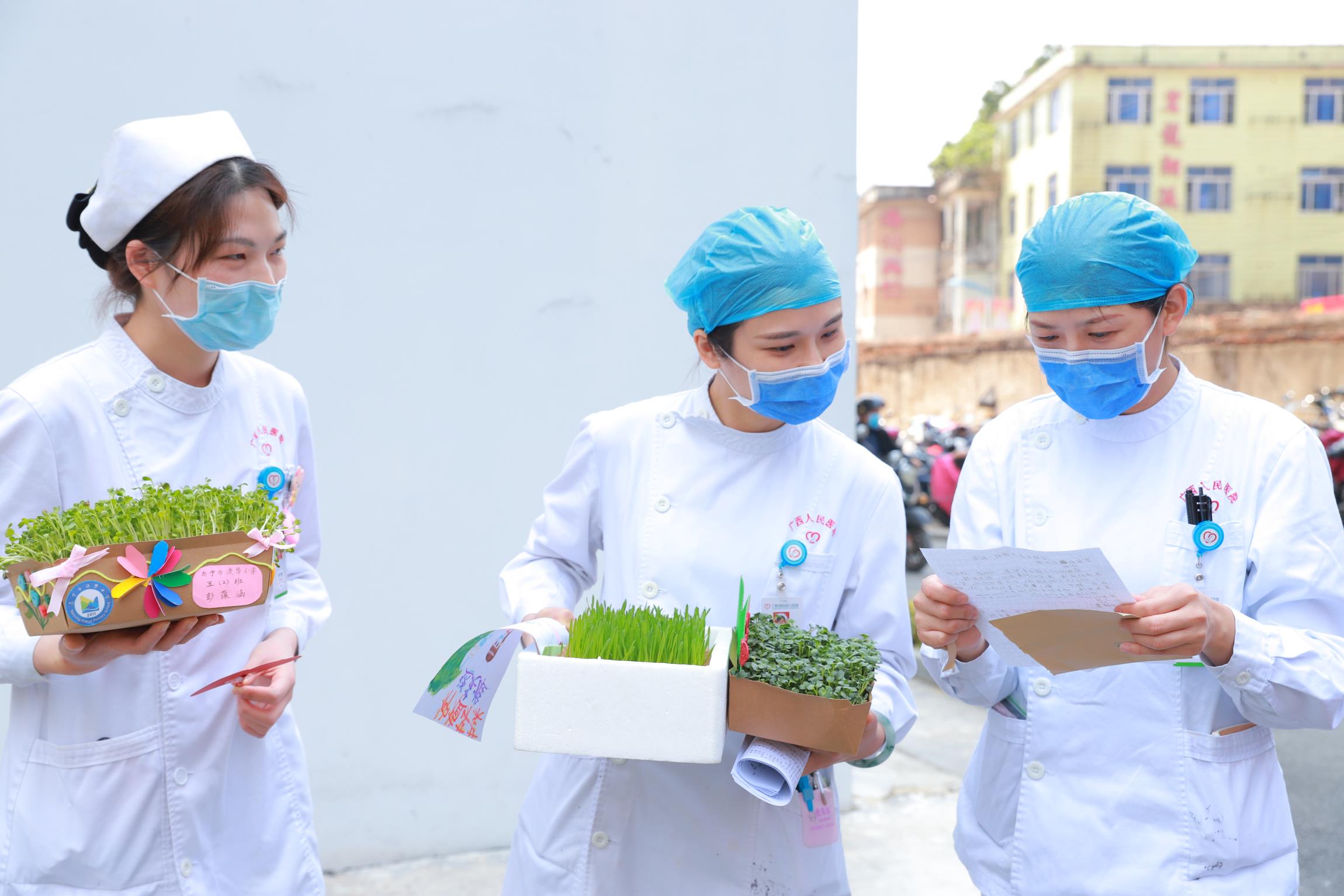小小志願者們每天按時澆水、精心呵護,用圖片、視頻、觀察日記等方式記錄「小綠植」的生長蛻變。4月14日,9名小小志願者代表在家長和愛心大使的陪護下,將第一批破土而出並茁壯成長的「小綠植」送到了自治區人民醫院及廣西「小湯山醫院」抗疫醫護工作者的手裡。