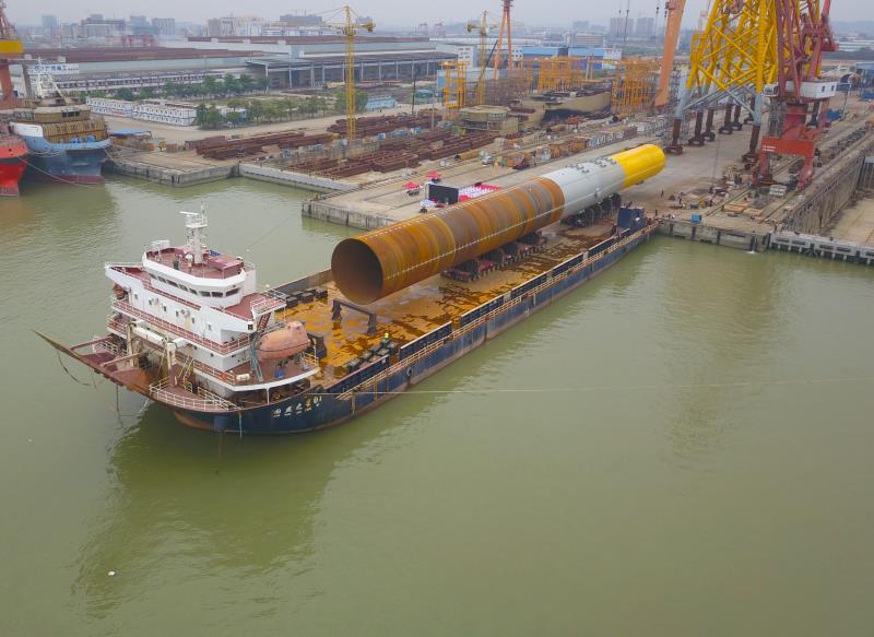 據介紹,總部設在南沙的文船重工此次交付的單樁是廣東省海上風電重點建設項目——保利長大明陽陽江沙扒30萬千瓦科研示範海上風電場的首個海上風電單樁,甲方為保利長大工程有限公司。該單樁直徑8.8米,長103.4米,最大板厚85毫米,重1644.3噸,已經達到一艘輕型護衛艦的重量,這是目前世界上最大的風電單樁之一。