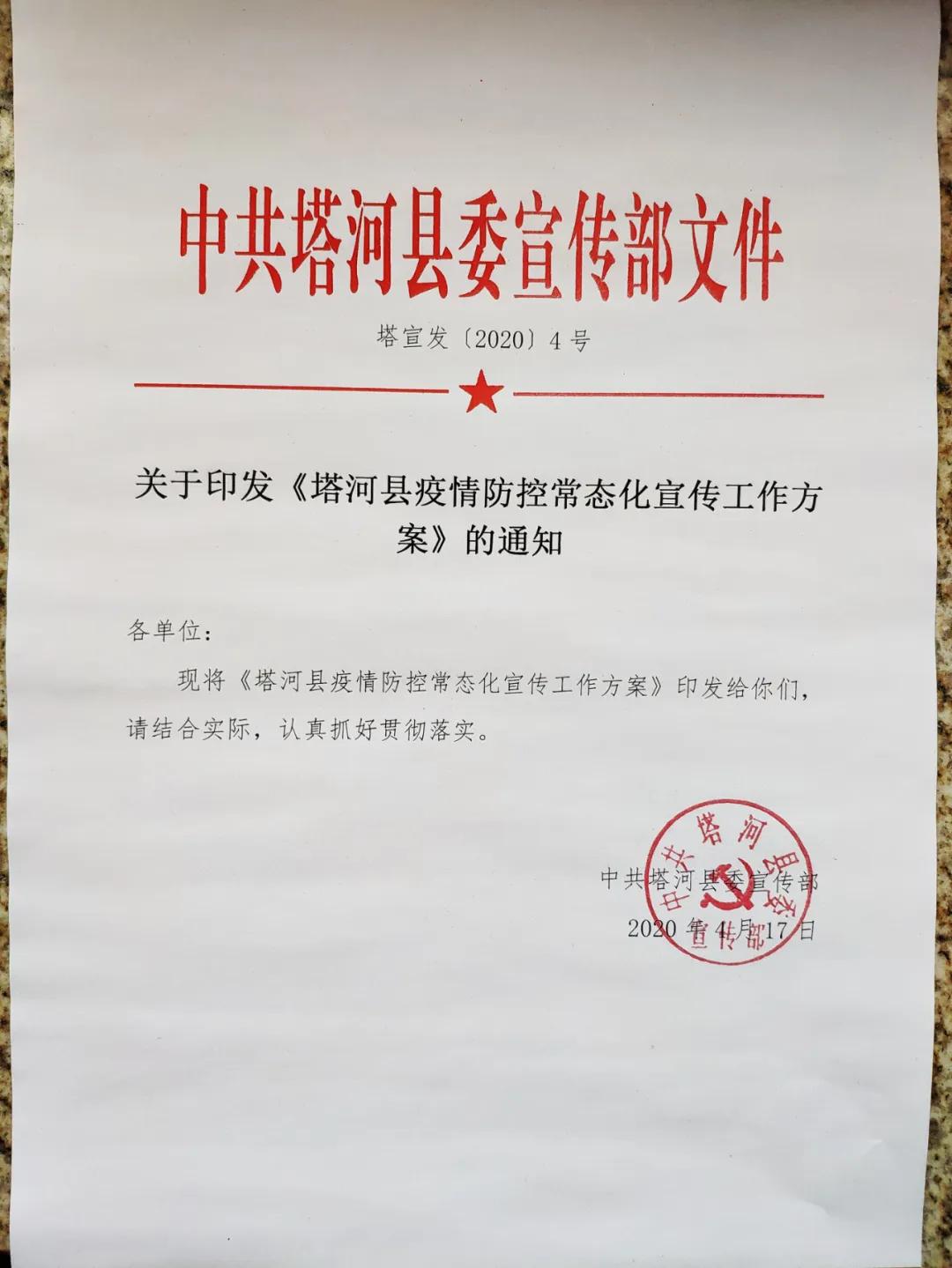 提高政治站位,壓實工作責任。結合地委行署及縣疫防指對當前疫情防控形勢的新判斷,塔河縣委宣傳部積極響應,對照宣傳報道與網絡輿情工作職責,迅速調整制定了《塔河縣疫情防控常態化宣傳工作方案》,對新聞宣傳、輿論引導和社會宣傳等相關工作進行了再安排、再強調、再落實,確保疫情防控常態化宣傳和輿論引導工作有力有序推進。