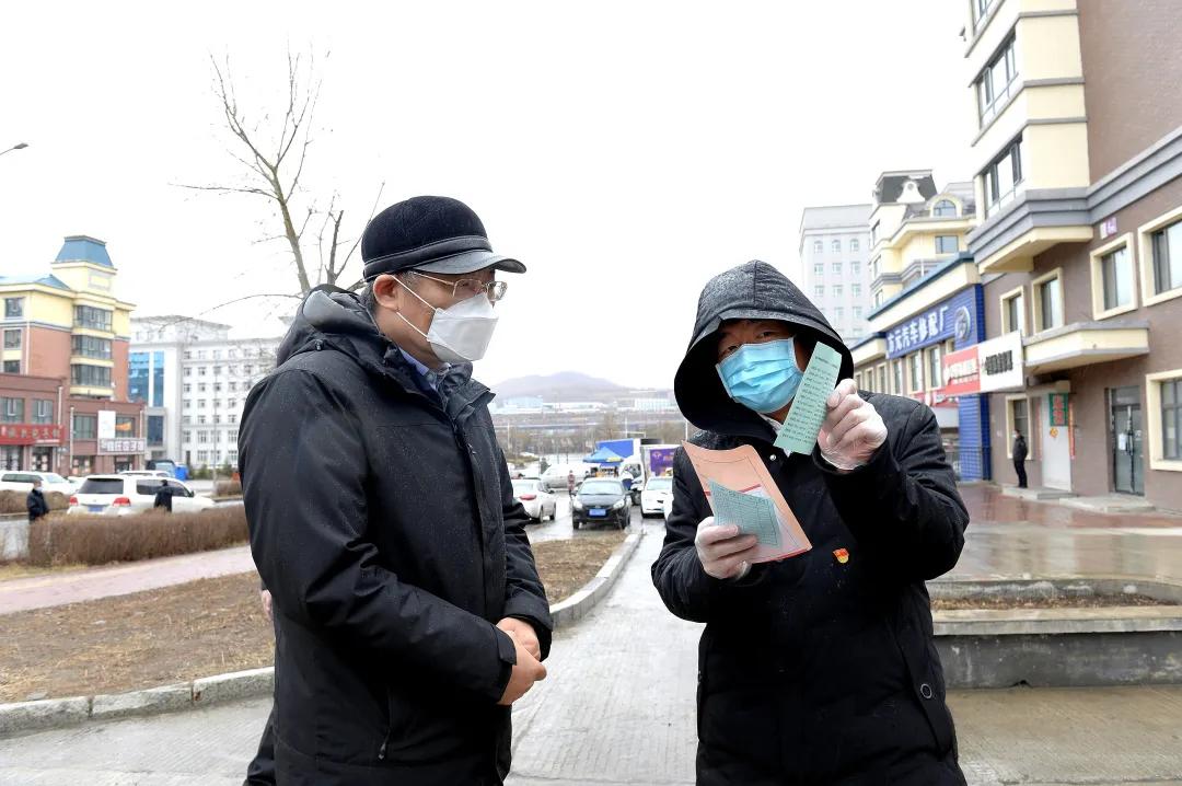 王文濤在綏芬河海融·富華苑小區檢查小區測溫、掃碼、登記流程