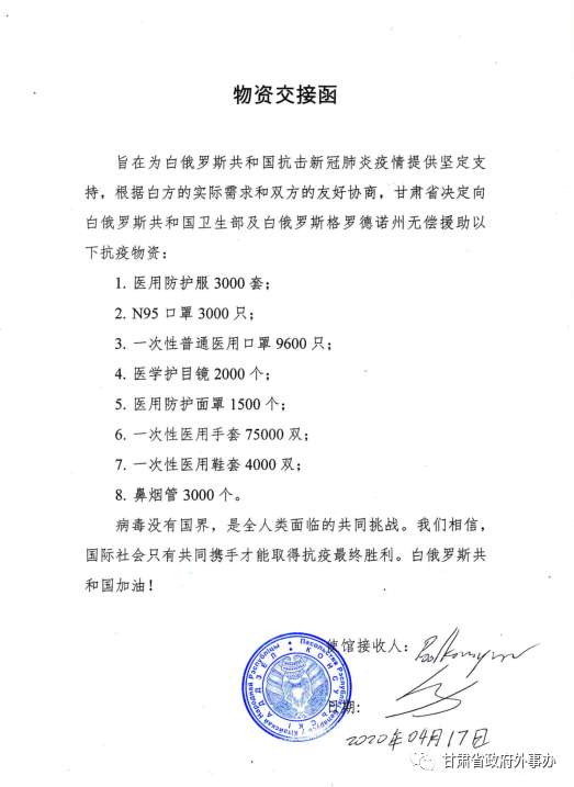 對於甘肅省提供的物資藥品援助,白駐華使館專門致函該省外事辦表示:“白俄羅斯駐華使館很榮幸地接受甘肅省捐贈的新冠肺炎‘甘肅方劑’中藥顆粒劑,甘肅省對所捐助藥品在白俄羅斯境內使用的後果不承擔任何責任”。據了解,白國家電視台、白俄羅斯新聞網、《格羅德諾州真理報》等主流媒體對甘肅省援助反響熱烈,紛紛進行了報道。(寇剛 楊文麗)
