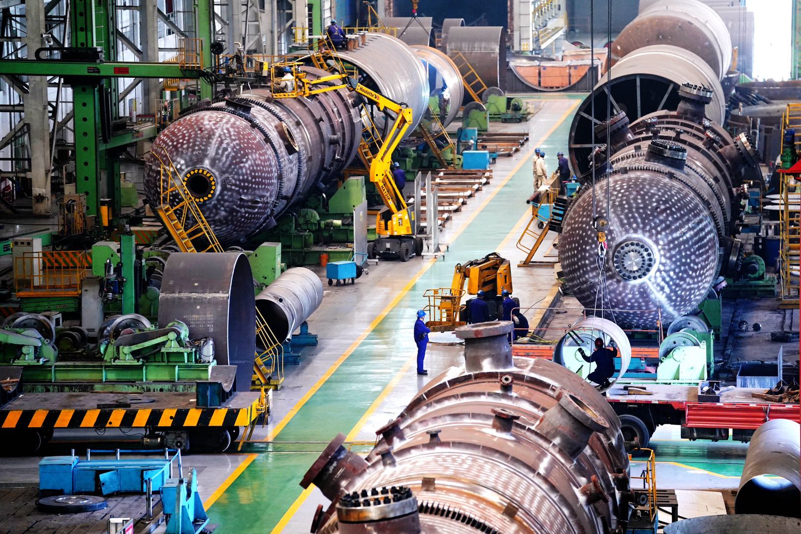 內蒙古匯能氣化爐生產的關鍵時期正值新冠疫情暴發,為了完成生產任務,重容分廠一方面認真細緻做好疫情防控工作,另一方面發揚鐵軍精神加班加點組織生產,確保將疫情對國家重點工程建設造成的影響降到最低。重容分廠面對工期緊張、製造難度大等困難毫不退縮,立刻組織生產動員,從技術改進、質量保障、提升效率等方面不斷討論優化。精細生產組織,合理調配人員及設備,加強工序銜接,壓縮製造周期,滿足用戶要求。為了提高生產效率,採用製造難度更大的先分段後總裝方式進行生產,將產品分為下錐、下筒體、上筒體三部分分別加工,通過增加同時生產的人數、靈活錯開各部分生產資源的佔用,極大地提高了人員利用率,縮短了整體製造周期。