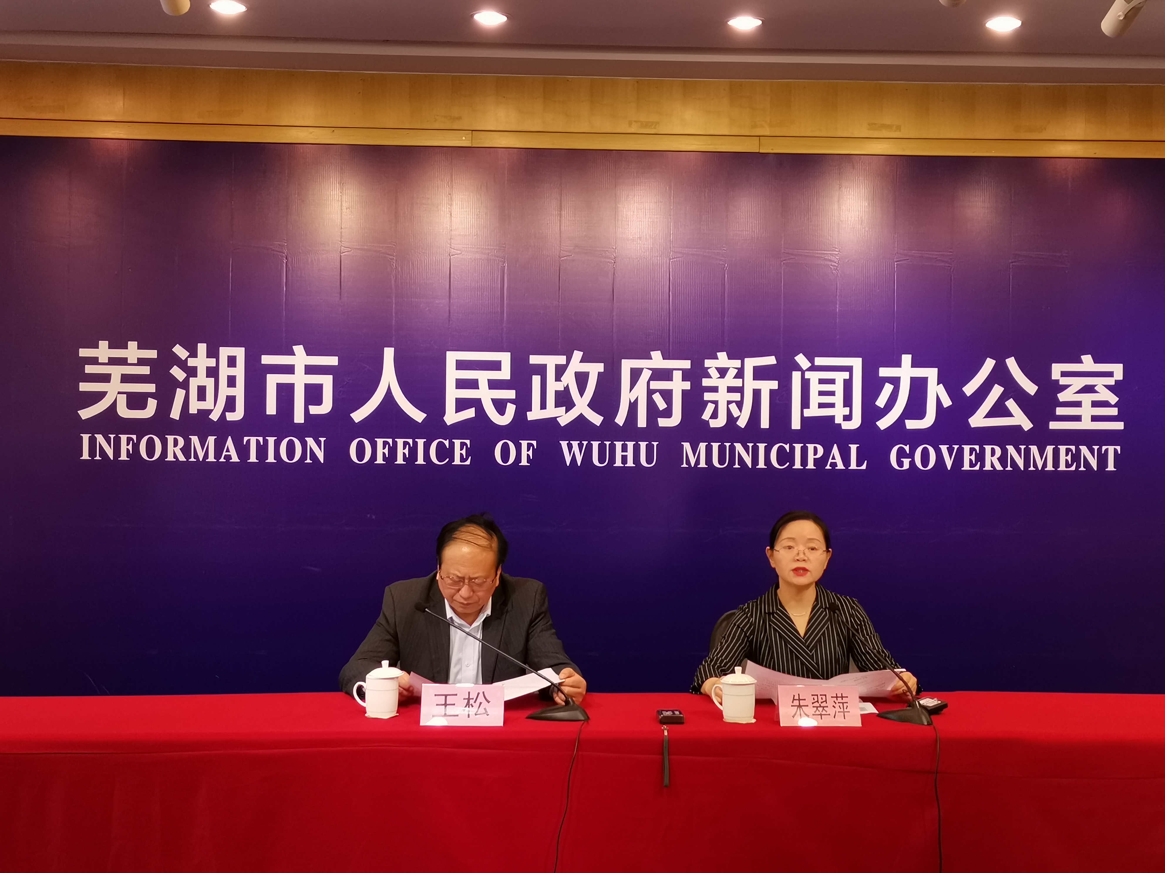 蕪湖市2020年一季度經濟運行情況新聞發佈會現場。左起:蕪湖市統計局黨組成員、副局長王松主持新聞發佈會,黨組成員、副局長朱翠萍介紹相關情況