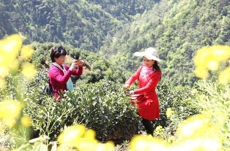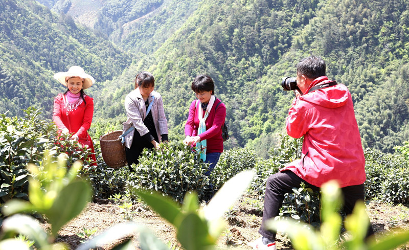 【香港商報網訊】4月22日,安徽歙縣溪頭鎮汪滿田村婦聯主席汪多耳(左一)引來遊客到竹嶺自然村採摘“滴水香”茶葉。