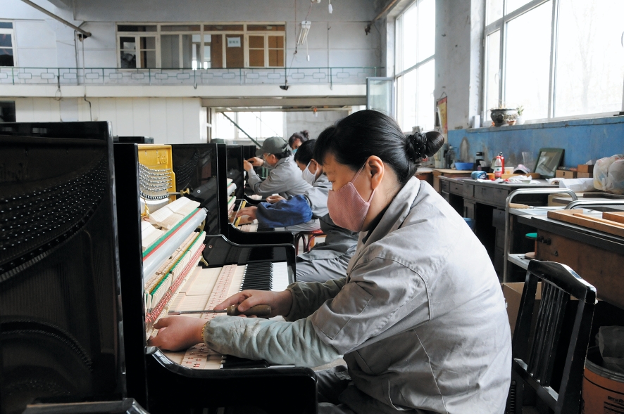 打磨、噴漆、組裝、上弦、調音……走進海倫鋼琴(營口)有限公司車間里,機器轟鳴聲及樂器調試聲此起彼伏,一片繁忙的生產景象。