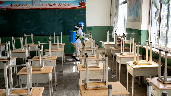 4月22日,清徐縣藍天救援隊的隊員們身著防護服,手持迷霧機正對全縣範圍內初級中學的宿舍、食堂、教室、校園進行了全方位專業消殺。