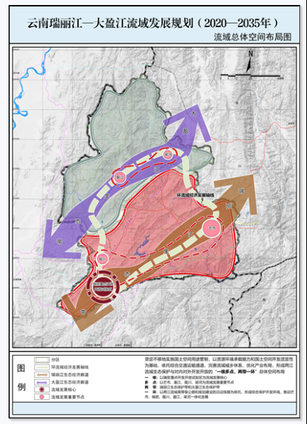 《規劃》強化生態安全保護,科學規劃空間布局,以資源環境承載能力和國土空間開發適宜性為基礎,依託綜合交通運輸通道,完善流域城鄉體系,優化產業布局,推動形成兩江流域生態保護與對內對外開發開放的「一核多點,兩帶一環」的流域總體空間布局。以瑞麗重點開發開放試驗區為流域發展核心,打造成為中緬兩國邊境經濟貿易中心、輻射中心前沿國際陸港和沿邊國際文化交流示範窗口。以芒市、盈江、隴川、梁河為流域發展重要節點。以瑞麗江、大盈江流域範圍為邊界,以生態保護為重點,協調經濟社會發展各要素,優化國土空間布局,形成兩江生態保護帶。以兩江流域高等級公路和規劃建設的沿邊鐵路為依託,形成綜合保護開發環線,推動芒市、瑞麗、隴川、盈江、梁河一體化發展。