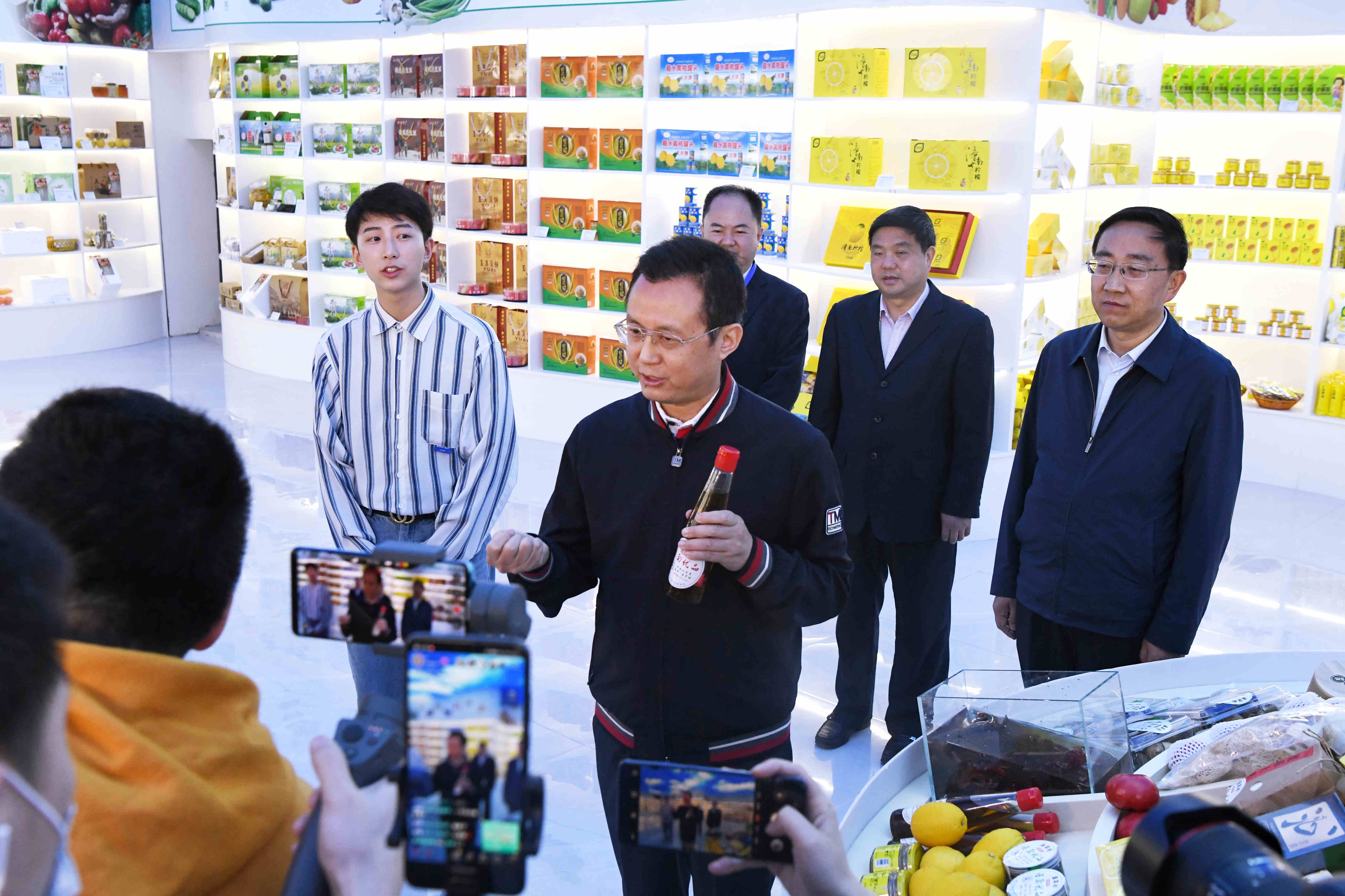 潼南書記曾菁華(居中)為潼南農產品直播「帶貨」