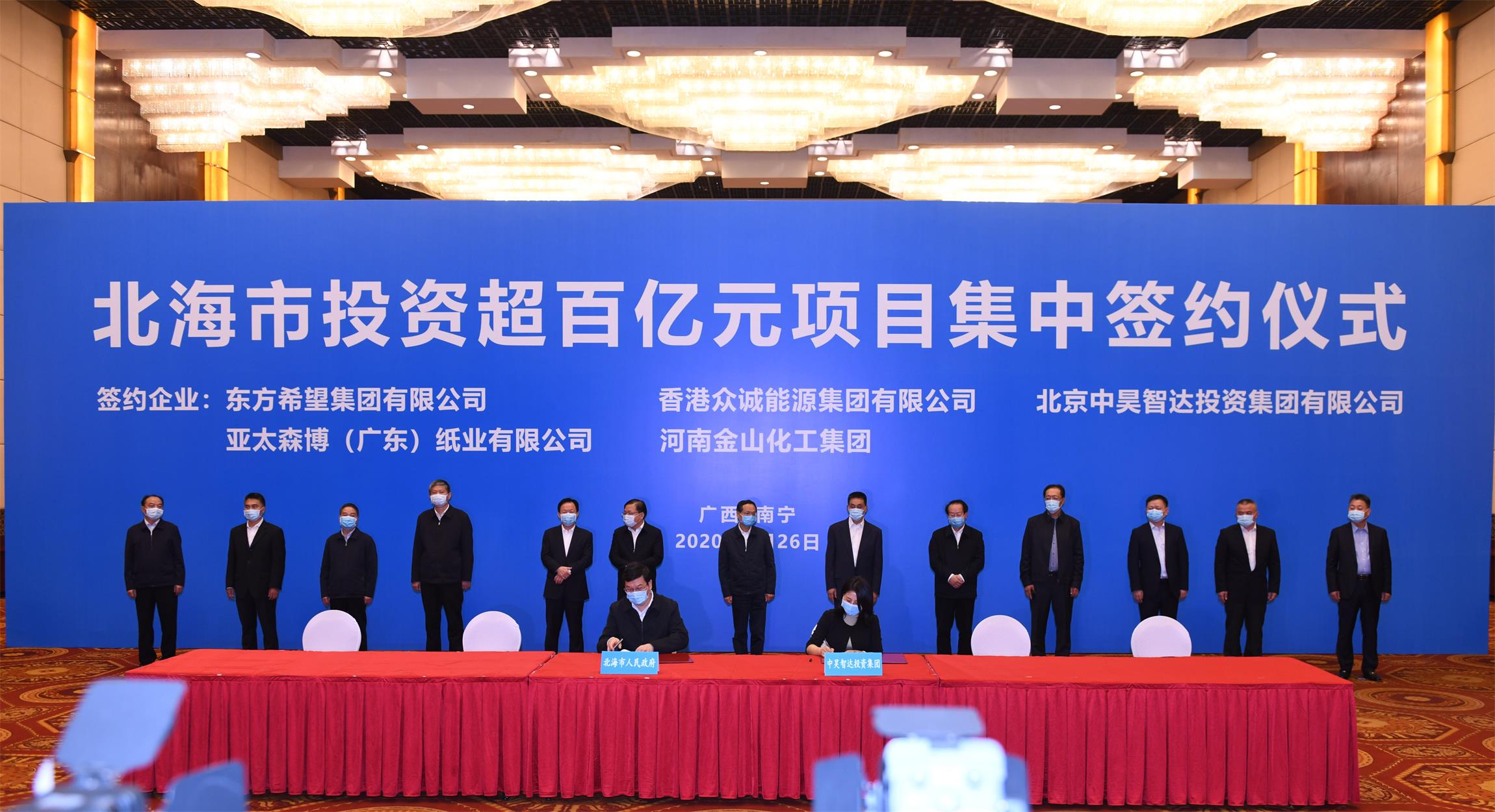 【香港商報網訊】4月26日,廣西北海市投資超百億元項目集中籤約儀式在南寧舉行。簽約儀式上,北海市與東方希望集團、香港眾誠能源集團、北京中昊智達投資集團、亞太森博(廣東)紙業有限公司、河南金山化工集團等5家企業簽署投資合作協議,項目投資總額2990億元。