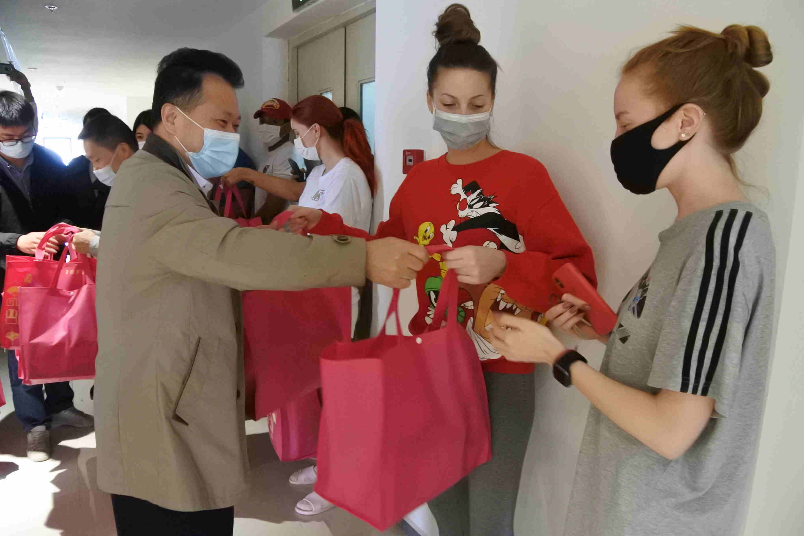 據了解,日前,花城街主要領導帶隊探訪融創樂園19名外籍員工,對他們表示親切的關懷和慰問,並送上餅乾、堅果等禮品和防疫口罩,被隔離人員感到十分溫暖,開心之情溢於言表。