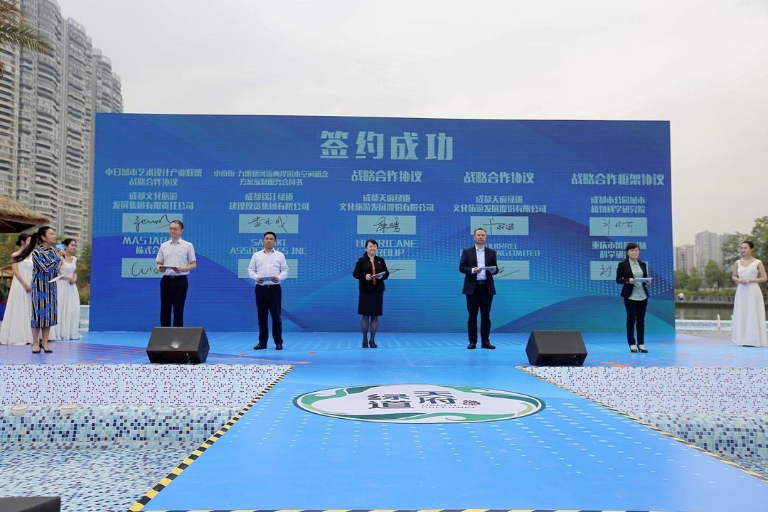 發佈會現場舉行了「雲簽約」儀式,成都文旅集團和MAS株式會社、錦江綠道公司和SASAKI、天府綠道公司與法國Hurrican集團賽事合作戰略協議、天府綠道公司和新西蘭Squirrel Consulting Limited公司、成都市公園城市植物科學研究院和重慶市風景園林科學研究院分別簽署合作項目。五大合作項目總投資額50億元。來自日本、美國、法國、新西蘭、中國重慶的企業和機構,將與公園城市建設有關的成都新經濟企業一道,在文創、體育、景觀設計、生態修復等領域,促進有效投資、增加有效需求,創新綠道價值多維轉化,推進農商文旅體融合的綠道新經濟發展。